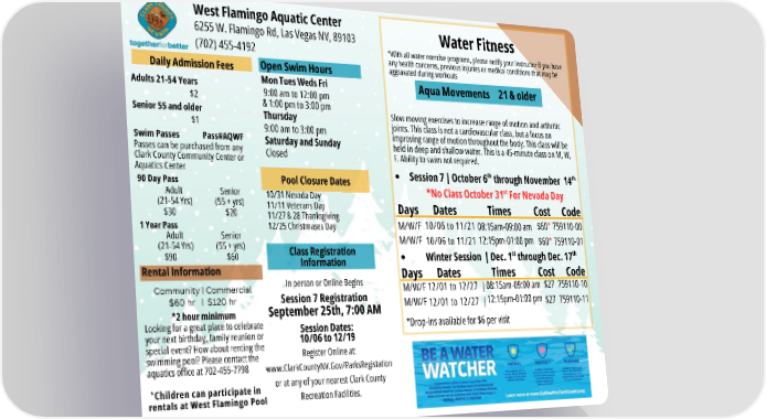 M/W/F M/W/F 12/01 to 12/27 | 12/01 to 12/27 | 08:15am-09:00 am 12:15pm-01:00 pm 759110-10 $27 Rental Information *2 hour minimum Looking for a great place to celebrate your next birthday, family reunion or special event? How about renting the swimming pool? Please contact the aquatics office at 702-455-7798 *Children can participate in rentals at West Flamingo Pool Daily Admission Fees Class Registration Information Pool Closure Dates Open Swim Hours Mon Tues Weds Fri 9:00 am to 12:00 pm & 1:00 pm to 3:00 pm Thursday 9:00 am to 3:00 pm Saturday and Sunday Closed 6255 W. Flamingo Rd, Las Vegas NV, 89103 (702) 455-4192 West Flamingo Aquatic Center Adults 21-54 Years $2 Senior 55 and older $1 Swim Passes Pass#AQWF Passes can be purchased from any Clark County Community Center or Aquatics Center 90 Day Pass Adult Senior (21-54 Yrs) (55 + yrs) $30 $20 1 Year Pass Adult Senior (21-54 Yrs) (55 + yrs) $90 $60 10/31 Nevada Day 11/11 Veterans Day 11/27 & 28 Thanksgiving 12/25 Christmases Day In person or Online Begins Session 7 Registration September 25th, 7:00 AM Session Dates: 10/06 to 12/19 Register Online at: www.ClarkCountyNV.Gov/ParksRegistation or at any of your nearest Clark County Recreation Facilities. *With all water exercise programs, please notify your instructor if you have any health concerns, previous injuries or medical conditions that may be aggravated during workouts Water Fitness Aqua Movements 21 & older Slow moving exercises to increase range of motion and arthritic joints. This class is not a cardiovascular class, but a focus on improving range of motion throughout the body. This class will be held in deep and shallow water. This is a 45-minute class on M, W, F. Ability to swim not required. Session 7 | October 6 through November 14 *No Class October 31 For Nevada Day th th st M/W/F M/W/F Dates Times Cost 10/06 to 11/21 10/06 to 11/21 08:15am-09:00 am 12:15pm-01:00 pm 759110-01 759110-00 $60* $60* Code Days *Drop-ins available for $6 per visit Community | Commercial $60 hr | $120 hr Winter Session | Dec. 1 through Dec. 17 st th 759110-11 $27 Dates Times Cost Code Days