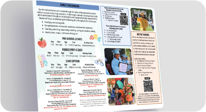 Required documents due by the student’s first day of class: Registration Packet Copy of Birth Certificate Shot Records Health Evaluation Due within 30 days EARLY CHILDHOOD Day Time Age Cost Activity Code M,W,F 9am-2pm 4-5 $210 ($14 per day) 9 Paradise Preschool Camp PRE-SCHOOL (2 DAY) Our Pre-School classes are licensed through the State of Nevada which provide children a creative learning experience. Children gain valuable developmental skills which are fostered through social interaction and independent play opportunities. Classes will focus on developing the following skills throughout the school year: Your child will need to bring the following items daily: Full Size Backpack 1.5 Inch Binder Refillable Water Bottle Lunch and Afternoon Snack NO Peanuts or Nuts Extra Change of Clothes Day Time Age Cost Activity Code T,TH 9am-2pm 3-4 $140 ($14 per day) 9 Paradise Preschool KINDER PREP (3 DAY) 5 DAY OPTION Day Time Age Cost Activity Code M -F 9am-2pm 3-5 $350 ($14 per day) 9 Paradise Preschool Session 1: August 25 - September 26 Registration: July 25 (online), July 28 (walk-in) No School: September 1 and 15 Session 2: September 29 - October 31 Priority Registration: Sep. 15 - 19 Registration: Sept. 19 (online), Sept. 22 (walk- in) No School: October 17, 24, and 31 Session 3: November 3 - December 12 Priority Registration: Oct. 20 - 24 Registration: Oct. 24 (online), Oct. 27(walk-in) No School: November 10 and 11, Nov. 24 - 28 (Fall Break) Session 4: December 15 - January 30 Priority Registration: Dec. 1 - 5 Registration: Dec. 5 (online), Dec. 8 (walk-in) No School: Dec. 19, Dec. 22 - Jan. 2 (Winter Break), January 9, 19, and 26 Session 5: February 2 - March 6 Priority Registration: Jan. 20 - 23 Registration: Jan. 23 (online), Jan. 26 (walk-in) No School: Feb. 9 and 16 Session 6: March 9 - April 17 Priority Registration: Feb. 23 - 27 Registration: Feb. 27 (online), March 2 (walk-in) No School: March 16 - 20 (Spring Break), March 3 and 6 Mini Session 7: April 20 - May 15 Priority Registration: April 6 - 10 Registration: April 10 (online), April 13 (walk-in) No School: April 27, May 15 (Graduation Day) We do not accept new participant enrollments for Sessions 6 and 7. New participants would be able to enroll for the 2026 summer session and/or the 2026-2027 school year. WE’RE HIRING We are recruiting innovative, enthusiastic and result-orientated leaders to join our team! We are seeking community and safety-oriented individuals, with a desire to share their passion for recreation with a wide range of age groups and people. Email [email protected] Current Recruitments Early Education/Pre-School Teacher Gymnastic/Tumbling Instructors Sports Instructors/Coaches Summer Day Camp/Youth Programs Leaders Tiny Tot Program Instructors Sports, Art, Etc. Part-time employment will not lead to permanent employment. Part-time hourly employees are used to fill positions normally less than twenty (20) hours per week. Part- time employees do not receive benefits. Pencil grip and writing skills Recognizing letters and sounds, vocabulary and phonemic awareness Counting, patterning, sequencing, matching, sorting and problem solving Identify color, shapes, and texture through art