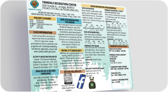 HOLIDAY CLOSURES YOUTH RECREATION PROGRAMMING ENGLISH AS A SECOND LANGUAGE CLASS INFORMATION Clark County offers two forms of registration; Internet and Walk-in. Internet registration allows participants to secure a position in the programs with immediate availability. For internet registration, please visit: www.clarkcountyNV.gov/parks ACTIVITY REGISTRATION DATES Session 7 & 8 Internet & Walk-In Registration starts: Oct. 27th, 2025 Session 7 Class Dates: 10/6 - 11/15 Session 8 Class Dates: 12/1 - 12/20 3200 Ferndale St., Las Vegas, NV 89121 (702)455-7517 (Rec.) & (702)455-8502 (SR.) PARKDALE RECREATION CENTER 10/31 11/11 11/28,29 12/25 1/1 OPEN RECREATION Daily activities include arts & crafts, games, sports, video games, movie days & themed events. Times/Dates subject to change. Parents must register their child/ren if they are new to the program. Day Time Age Cost M-TH 2:30-5:30 PM 6-12 yrs. Free Family Time Friday (Adults must monitor their youth) Fri 10 AM - 2 PM All ages Adults $2 TEEN OPEN BASKETBALL Come shoot hoops in Parkdale Gymnasium! Times/Dates are subject to change due to Center events. PARKDALE PEP SQUAD Come and experience the Parkdale spirit with chants, cheer routines & even cheer at live events! All must wear athletic shoes. Poms will be provided. Instructor: Coach Chelsea NEVADA DAY VETERAN DAY THANKSGIVING/FAMILY DAY CHRISTMAS NEW YEARS THIS BROCHURE WAS UPDATED ON 10/22/2026 NON-DISCRIMINATION STATEMENT Clark County government is a recipient of federal funding for some of its programs and activities. The County is committed to administering these programs and activities for the benefit of all citizens in compliance with the County’s non-discrimination policies, which are consistent with the requirements of federal civil rights regulations OH NO, IT’S CANCELLED?! Nothing ruins a good program than waiting until the last minute to register! Please register early to avoid disappointment! We ratio each program to allow the right amount of supplies, meals, equipment and sanitization efforts. Thank you. DO YOU FOLLOW US?! Keep up to date with all the happenings at Parkdale! Day Date Time Age Cost T & TH ongoing 2-4 PM 13-17 yrs. Free PARKDALE BASKETBALL CLINICS BEGINNING BASKETBALL SKILLS Players will be introduced to new skills in conditioning, proper shot technique, being a team player. Instructor: Coach Smiles Day Date Time Age Cost Wednesday 10/6 - 11/15 5-6 PM 6-12 yrs. Free Wednesday 12/1- 12/20 5-6 PM 6-12 yrs. Free Beginner Monday 10/27 - 11/15 4-5 PM 6-13 yrs Free Tales From The Dales* OCT 31st | 6:00pm - 9:00 PM PARKDALE FOOD & GROOVE* 11/25-12/23 @9:00 AM Tuesday *(see flyer for details) RECREATION BUILDING: Monday - Friday | 7 AM - 6 PM SENIOR BUILDING: Monday | 8 AM - 12 PM & Tuesday- Friday | 8 AM- 3 PM Learn ESL at Parkdale! Classes are held Monday - Thursday, 8:00 - 11:00 AM. Please call (702)651-4747 OR (702)215-4732 to get registered! COMMUNITY SPECIAL EVENTS ADVANCED BASKETBALL SKILLS Players will enhance skills in conditioning, proper shot technique, offense/defense tactics and being a team player. Instructor: Coach Olynsso Day Date Time Age Cost Friday 10/6 - 11/15 4-6 PM 9-13 yrs Free Friday 12/1 - 12/20 4-6 PM 9-13 yrs Free COMMUNITY BABY SHOWER NOV 15th | 10:00 AM- 1:00 PM PANCAKES & PJ’s Dec. 13th| 9:00am-11:00 SKATEY-8 CHRISTMAS EVENT Dec. 17| 6PM Bitty Ball Basketball League Registration starts Dec 1st ages 4-6 yrs old $5 (see flyer)