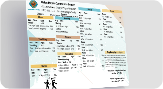 Cheer Music Tumbling Music Day Time Cost Skating Fri 4:00pm-5:00pm $26 Skating Fri 5:00pm-6:00pm $26 4525 New Forest Drive Las Vegas NV 89147 (702) 455-7723 clarkcountynv.gov/parks Helen Meyer Community Center Day Time Ages Cost Cheer 6-12 Tues 4pm-5pm Intermediate $26 Tues 5pm-6pm Beginner $26 Skating Day Time Cost VOICE MON 3:30pm-4pm $75 VOICE MON 4pm-4:30pm $75 VOICE MON 4:30pm-5pm $75 VOICE MON 5pm-5:30pm $75 VOICE MON 5:30pm-6pm $75 Classes Session 1 1/5/26 - 2/14/25 Registration opens: 11/26/25 Day Time Ages Cost Tumbling 6-12 Thur 4pm-5pm Intermediate $26 Thur 5pm-6pm Beginner $26 Day Time Age Cost Theater Tues 5:00pm-6:00pm 6-12 $26 Fri 5:00pm-6:00pm 6-12 $26 Theater Piano Wed 3:30pm-4pm $90 Piano Wed 4pm-4:30pm $90 Piano Wed 4:30pm-5pm $90 Piano Wed 5pm-5:30pm $90 Piano Wed 5:30pm-6pm $90 Piano Fri 3:30pm-4pm $90 Piano Fri 4pm-4:30pm $90 Piano Fri 4:30pm-5pm $90 Piano Fri 5pm-5:30pm $90 Piano Fri 5:30pm-6pm $90 Dance Day Time Ages Cost Jazz 6-12 Mon 4:30pm-5:30pm $22 Day Camp 6yrs. - 12yrs. Winter Day Camp Registration: October 16 , 2025 th Winter Day Camp Dates: December 22 - 31 nd st Day Camp is designed for children ages 6-12 years old. Children can participate in a variety of activities including: board games, indoor/outdoorgames, arts n crafts, special events, and movies (G or PG). *Must bringtwo snacks and a lunch that doesn’t need to be heated or refrigerated and a refillable water bottle. Day Time Age Cost Homework help Mon., Wed., or Fri 4:00pm-5:00pm Ages 5-17 $40 5:00pm-6:00pm Ages 5-17 $40 Drop in rate: $10 Education