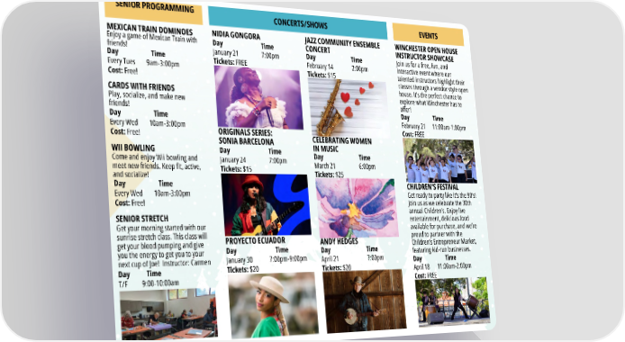 PROYECTO ECUADOR Day Time January 30 7 :00pm-9:00pm Tickets: $20 ANDY HEDGES ORIGINALS SERIES: SONIA BARCELONA Day Time April 21 7 :00pm Tickets: $20 Day Time February 14 2 :00pm Tickets: $15 WINCHESTER OPEN HOUSE INSTRUCTOR SHOWCASE Join us for a free, fun, and interactive event where our talented instructors highlight their classes through a vendor style open house. It’s the perfect chance to explore what Winchester has to offer! Day Time February 21 11 :00am-1:00pm Cost: FREE CHILDREN’S FESTIVAL JAZZ COMMUNITY ENSEMBLE CONCERT NIDIA GONGORA Day Time January 21 7 :00pm Tickets: FREE Day Time January 24 7 :00pm Tickets: $15 CELEBRATING WOMEN IN MUSIC Day Time March 21 6 :00pm Tickets: $25 SENIOR PROGRAMMING CARDS WITH FRIENDS Play, socialize, and make new friends! Day Time Every Wed 10am-3:00pm Cost: Free! SENIOR STRETCH Get your morning started with our sunrise stretch class. This class will get your blood pumping and give you the energy to get you to your next cup of Joe! Instructor: Carmen Day Time T /F 9:00-10:00am WII BOWLING Come and enjoy Wii bowling and meet new friends. Keep fit, active, and socialize! Day Time Every Wed 10am-3:00pm Cost: Free! MEXICAN TRAIN DOMINOES Enjoy a game of Mexican Train with friends! Day Time Every Tues 9am-3:00pm Cost: Free! CONCERTS/SHOWS EVENTS Get ready to party like it’s the 90’s! Join us as we celebrate the 30th annual Children’s. Enjoy live entertainment, delicious food available for purchase, and we’re proud to partner with the Children’s Entrepreneur Market, featuring kid-run businesses. Day Time April 18 11 :00am-2:00pm Cost: FREE