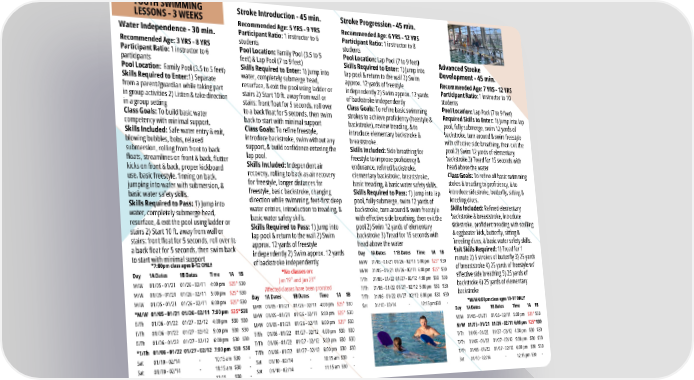 Water Independence - 30 min. Recommended Age: 3 YRS - 8 YRS Participant Ratio: 1 instructor to 6 participants Pool Location: Family Pool (3.5 to 5 feet) Skills Required to Enter: 1) Separate from a parent/guardian while taking part in group activities 2) Listen & take direction in a group setting Class Goals: To build basic water competency with minimal support. Skills Included: Safe water entry & exit, blowing bubbles, bobs, relaxed submersion, rolling from front to back floats, streamlines on front & back, flutter kicks on front & back, proper kickboard use, basic freestyle, finning on back, jumping into water with submersion, & basic water safety skills. Skills Required to Pass: 1) Jump into water, completely submerge head, resurface, & exit the pool using ladder or stairs 2) Start 10 ft. away from wall or stairs: front float for 5 seconds, roll over to a back float for 5 seconds, then swim back to start with minimal support YOUTH SWIMMING LESSONS - 3 WEEKS Recommended Age: 5 YRS - 9 YRS Participant Ratio: 1 instructor to 6 students Pool Location: Family Pool (3.5 to 5 feet) & Lap Pool (7 to 9 feet) Skills Required to Enter: 1) Jump into water, completely submerge head, resurface, & exit the pool using ladder or stairs 2) Start 10 ft. away from wall or stairs: front float for 5 seconds, roll over to a back float for 5 seconds, then swim back to start with minimal support Class Goals: To refine freestyle, introduce backstroke, swim without any support, & build confidence entering the lap pool. Skills Included: Independent air recovery, rolling to back as air recovery for freestyle, longer distances for freestyle, basic backstroke, changing direction while swimming, feet-first deep water entries, introduction to treading, & basic water safety skills. Skills Required to Pass: 1) Jump into lap pool & return to the wall 2) Swim approx. 12 yards of freestyle independently 2) Swim approx. 12 yards of backstroke independently Recommended Age: 6 YRS - 12 YRS Participant Ratio: 1 instructor to 8 students Pool Location: Lap Pool (7 to 9 feet ) Skills Required to Enter: 1) Jump into lap pool & return to the wall 2) Swim approx. 12 yards of freestyle independently 2) Swim approx. 12 yards of backstroke independently Class Goals: To refine basic swimming strokes to achieve proficiency (freestyle & backstroke), review treading, & to introduce elementary backstroke & breaststroke. Skills Included: Side breathing for freestyle to improve proficiency & endurance, refined backstroke, elementary backstroke, breaststroke, basic treading, & basic water safety skills. Skills Required to Pass: 1) Jump into lap pool, fully submerge, swim 12 yards of backstroke, turn around & swim freestyle with effective side breathing, then exit the pool 2) Swim 12 yards of elementary backstroke 3) Tread for 15 seconds with head above the water Day 1A Dates 1B Dates Time 1A 1B M/W 01/05 - 01/21 01/26 - 02/11 4:00 pm $25* $30 M/W 01/05 - 01/21 01/26 - 02/11 5:00 pm $25* $30 M/W 01/05 - 01/21 01/26 - 02/11 6:00 pm $25* $30 *M/W 01/05 - 01/21 01/26 - 02/11 7:00 pm $25* $30 T/Th 01/06 - 01/22 01/27 - 02/12 4:00 pm $30 $30 T/Th 01/06 - 01/22 01/27 - 02/12 5:00 pm $30 $30 T/Th 01/06 - 01/22 01/27 - 02/12 6:00 pm $30 $30 *T/Th 01/06 - 01/22 01/27 - 02/12 7:00 pm $30 $30 Sat 01/10 - 02/14 - 10:15 am $30 - Sat 01/10 - 02/14 - 11:15 am $30 - Sat 01/10 - 02/14 - 12:15 $30 - Day 1A Dates 11B Dates Time 1A 1B M/W 01/05 - 01/21 01/26 - 02/11 5:00 pm $25* $30 M/W 01/05 - 01/21 01/26 - 02/11 6:00 pm $25* $30 T/Th 01/06 - 01/22 01/27 - 02/12 4:00 pm $30 $30 T/Th 01/06 - 01/22 01/27 - 02/12 5:00 pm $30 $30 T/Th 01/06 - 01/22 01/27 - 02/12 6:00 pm $30 $30 Sat 01/10 - 02/14 - 12:15 pm $30 - Day 1A Dates 1B Dates Time 1A 1B M/W 01/05 - 01/21 01/26 - 02/11 4:00 pm $25* $30 M/W 01/05 - 01/21 01/26 - 02/11 5:00 pm $25* $30 M/W 01/05 - 01/21 01/26 - 02/11 6:00 pm $25* $30 T/Th 01/06 - 01/22 01/27 - 02/12 4:00 pm $30 $30 T/Th 01/06 - 01/22 01/27 - 02/12 5:00 pm $30 $30 T/Th 01/06 - 01/22 01/27 - 02/12 6:00 pm $30 $30 Sat 01/10 - 02/14 - 10:15 am $30 - Sat 01/10 - 02/14 - 11:15 am $30 - Day 1A Dates 1B Dates Time 1A 1B M/W 01/05 - 01/21 01/26 - 02/11 5:00 pm $25* $30 M/W 01/05 - 01/21 01/26 - 02/11 6:00 pm $25* $30 T/Th 01/06 - 01/22 01/27 - 02/12 4:00 pm $30 $30 T/Th 01/06 - 01/22 01/27 - 02/12 5:00 pm $30 $30 T/Th 01/06 - 01/22 01/27 - 02/12 6:00 pm $30 $30 Sat 01/10 - 02/14 - 12:15 pm $30 - Stroke Introduction - 45 min. Stroke Progression - 45 min. Advanced Stroke Development - 45 min. Recommended Age: 7 YRS - 12 YRS Participant Ratio: 1 instructor to 10 students Pool Location: Lap Pool (7 to 9 feet) Required Skills to Enter: 1) Jump into lap pool, fully submerge, swim 12 yards of backstroke, turn around & swim freestyle with effective side breathing, then exit the pool 2) Swim 12 yards of elementary backstroke 3) Tread for 15 seconds with head above the water Class Goals: To refine all basic swimming stokes & treading to proficiency, & to introduce sidestroke, butterfly, sitting & kneeling dives. Skills Included: Refined elementary backstroke & breaststroke, introduce sidestroke, proficient treading with sculling & eggbeater kick, butterfly, sitting & kneeling dives, & basic water safety skills. Exit Skills Required: 1) Tread for 1 minute 2) 5 strokes of butterfly 3) 25 yards of breaststroke 4) 25 yards of freestyle w/ effective side breathing 5) 25 yards of backstroke 6) 25 yards of elementary backstroke *7:00pm class ages 8-12 ONLY *M/W 6:00pm class ages 10-17 ONLY *No classes on: Jan 19 and Jan 23 th rd Affected classes have been prorated
