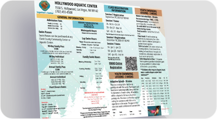 GENERAL INFORMATION CLASS REGISTRATION INFORMATION YOUTH SWIMMING LESSONS - 3 WEEKS Admission Fees Youth (3-17 YRS) $2 Adult (18-54 YRS) $3 Senior (55+ YRS) $1 Day 7A Dates 7B Dates Time 7A 7B M/W 10/6 - 10/22 10/27 - 11/12 8:15 am $30 $30 M/W 10/6 - 10/22 10/27 - 11/12 4:00 pm $30 $30 M/W 10/6 - 10/22 10/27 - 11/12 5:00 pm $30 $30 M/W 10/6 - 10/22 10/27 - 11/12 6:00 pm $30 $30 T/Th 10/7 - 10/23 10/28 - 11/13 8:15 am $30 $25 T/Th 10/7 - 10/23 10/28 - 11/13 4:00 pm $30 $25 T/Th 10/7 - 10/23 10/28 - 11/13 5:00 pm $30 $25 T/Th 10/7 - 10/23 10/28 - 11/13 6:00 pm $30 $25 Sat 10/11 - 11/15 - 10:15 am $30 - Sat 10/11 - 11/15 - 11:15 am $30 - YOUTH SWIMMING LESSONS - 3 WEEKS Adaptive Splash - 30 mins This class is designed to familiarize participants with the water. Participants will learn basic swimming skills, along with the fundamentals of water safety. All activities will be adapted to fit the needs of the participants. This class is offered in a group setting for swimmers with little or no experience in the water. The goal of this class is to build confidence in & around the water. Day Date Time Cost Sat 10/11 - 11/15 12:15 pm $30 SESSION 7 HOURS EFFECTIVE 09/29-11/15 *UPDATED 9/9 1A - Jan 5 - Jan 23 1B - Jan 26 - Feb 13 SAT - Jan 10 - Feb 14 *No class Mon 01/19; *No PM class Fri 01/23 Recommended Age: 6 MO. - 5 YRS. Participant Ratio: 1 instructor to 10 parent/guardian & student pairs An adult MUST be in the water at all times during classes. Pool Location: Family Pool (3.5 to 5 feet) Class Goals: To build swimming readiness by emphasizing fun in the water. Adults & children participate in guided classes together. Skills Included: Safe water entry & exit, blowing bubbles, front & back floats, kicking on front & back, freestyle arm movement, underwater exploration, & basic water safety skills. Skills Required to Pass: 1) Separate from a parent/guardian while taking part in group activities 2) Listen & take direction in a group setting **Children who require diapers must wear a swim diaper under their swimsuit** HWAQ Online Registration Swim Passes Swim Passes can be purchased at any Clark County Community Center or Aquatic Center. 90-Day Family Pass $100 Includes up to 4 family members in the same household. Additional members can be added for $20 each. 90 Day Individual Youth (3--17 YRS) $40 Adult (18-54 YRS) $60 Senior (55+ YRS) $20 Annual Family Pass $300 Includes up to 4 family members in the same household. Additional members can be added for $40 each. Annual Individual Youth (3--17 YRS) $120 Adult (18-54 YRS) $180 Senior (55+ YRS) $60 Water Introduction - 30 min. 1550 S. Hollywood, Las Vegas, NV 89142 (702) 455-8508 HOLLYWOOD AQUATIC CENTER Lap Swim Hours 10 lanes - 25 yards - 7 to 9 Feet Monday - Friday 7 am - 11 am & 2 pm - 8 pm Saturday 9 am - 4 pm Sunday CLOSED *Under 18 must do a swim test to use *Please note that pool hours/days of operation are subject to change/closure for inclement weather, special events, & unforeseeable events.* *Limited space in the lap &/or family pool due to programming.* Waterpark Hours Closed until Summer 2026 Family Swim Hours Monday, Wednesday 7 am - 9 am 2 pm - 4 pm Tuesday, Thursday 8 am - 10 am 2 pm - 4 pm Friday 7 am - 9 am 10 am - 11 am 2 pm - 8 pm Saturday 1 pm - 4 pm CLOSED Sunday Session 7 Registration September 29, 2025 @7:00 AM 7A - Oct 6 - Oct 24 7B - Oct 27 - Nov 14 SAT - Oct 11 - Nov 15 Session 7 Dates *No PM Class Fri 10/24; No class Fri 10/31 & Tue 11/11 No class Tue 11/11 Session 1 Registration December 18, 2026 @7:00 AM Session 7 Dates Pool Closure Dates October: Thur 2 - Closed at 4 pm nd Sat 4 - Closed th Fri 24 - Closed at 4 pm for Special Event th Fri 31st - Closed November: Thur 11 - Closed th Thur 20 - Closed at 4pm th Fri 21 - Closed at 4 pm for Special Event st Wed 26 - Closed at 11am th Thur 27 - Sun 30 - Closed th th December: Fri 19 - Closed at 4 pm for Special Event th INDOOR HOURS during Break Week 9/29-10/04 Mon, Tue, Wed, Fri: 7 am - 11 am; 2 pm - 8 pm Thur. 7 am - 11 am; 2 pm - 4 pm Saturday: CLOSED Sunday: CLOSED
