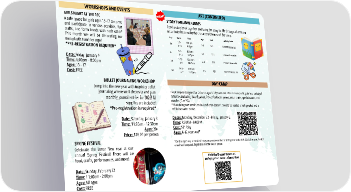 WORKSHOPS AND EVENTS DAY CAMP Day Camp is designed for children ages 6-12 years old. Children can participate in a variety of activities including: board games, indoor/outdoor games, arts n crafts, special events, and movies (G or PG). *Must bring two snacks and a lunch that doesn’t need to be heated or refrigerated and a refillable water bottle. Dates: Monday, December 22 - Friday, January 2 Time : 7:00AM - 6:00PM Cost: $21/day Ages: 6-12 years old * *Children age 5 may be enrolled if they are currently enrolled in Kindergarten for the 2025-2026 school year. Proof of enrollment is required. Registration must be done in person. Day Dates Time Age Cost Activity Code Fri 1/9- 2/13 4:00 pm - 4:45pm 2-3 $24 1 Desert Breeze Art Fri 1/9 - 2/13 5:00pm - 5:45pm 4-5 $24 1 Desert Breeze Art Sat 1/10 - 2/7 10:00am - 10:45am 2-3 $21 1 Desert Breeze Art Sat 1/10 - 2/7 11:00am - 11:45am 4-5 $21 1 Desert Breeze Art ART (CONTINUED) GIRLS NIGHT AT THE REC A safe space for girls ages 13-17 to come and participate in various activities, fun crafts, and form bonds with each other! This month we will be decorating our own plastic tumbler cups! *PRE-REGISTRATION REQUIRED* Date: Friday, January 9 Time: 6:00pm - 8:00pm Ages: 13 - 17 Cost: FREE Visit the Desert Breeze CC webpage for more information! BULLET JOURNALING WORKSHOP Jump into the new year with inspiring bullet journaling where we’ll decorate and plan monthly journal entries for 2026! All supplies are included! *Pre-registration is required* Date: Saturday, January 3 Time: 11:00am - 12:30pm Ages: 20+ Price: $10.00 per person SPRING FESTIVAL Celebrate the Lunar New Year at our annual Spring Festival! There will be food, crafts, performances, and more! Date: Sunday, February 22 Time: 11:00am - 2:00pm Ages: All ages Cost: FREE Read a storybook together and bring the story to life through a hands on art activity inspired by the characters/themes of the story. STORYTIME ADVENTURES
