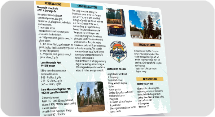 RESERVATIONS CAMP LEE CANYON SNOWSHOE CAMP Amphitheater with firepit Archery range Central bath house Dining hall with fireplace Kitchen Nurses quarters Outdoor dance floor and shelter Outdoor picnic area Playground Recreation hall with fireplace Ropes Course Sleeping accommodations for 145 Sports courts 6 Reservable areas: Areas C-G - Limit 50 people in each, 1 charcoal BBQ, 2 tables, bench seating around pavilion Area H - Limit 75 people, 4 large charcoal BBQ’s, 8 tables Lone Mountain Regional Park 9825 W Lone Mountain Rd 5 First come first serve areas 3 reservable areas: 1-99 - 7 tables, 2 grills 2-99 - 12 tables, 2 grills 3-75 - 7 tables, 3 grills Lone Mountain Park 4445 N Jensen The camp is nestled among the Ponderosa pines of the Lee Canyon area on 17 acres of land provided through a Special Use Permit with the U.S. Forest Service in the scenic surroundings of Toiyabe National Forest. The Charleston mountain Range and the Lee Canyon area containing hiking trails, Ponderosa pines and a collective assortment of animals such as deer, elk, eagles, hawks and owls, which are indigenous to this alpine setting. The canyons summer climate has a 76/40 degree temperature range with moderate rainfall and occasional thundershowers in late July and early August. An average winter brings a 30/-5 degree temperature variance with a 3-10 foot average snowfall. Amenities: Basketball court, community center, disc golf, horseshoe pit, playground, volleyball, and restrooms. 3 reservable areas -several first come first serve picnic areas with shade shelters -A - 100 person limit, gazebo cover, 14 picnic tables -B - 199 person limit, gazebo cover, 21 picnic tables, 4 grills (security required for over 100 persons) -C - 99 person limit, gazebo cover, 8 picnic tables, 2 grills Mountain Crest Park 4701 N Durango Dr AMMENITIES INCLUDE Join us February 20-22 at Camp Lee Canyon. You will participate in hikes during the day and at night. We will provide snowshoe rentals. There will also host a Chili cook off with a chance to win a prize. Registration is $50 per person Register today! Adventure Rec offers a day hike, sightseeing and a trip to the beautiful National Wildlife Refuge & Warm Springs Natural Area in Moapa Valley. This is a 2 mile hike $10 per person November 15 th MOAPA VALLEY HIKE ADVENTURE REC