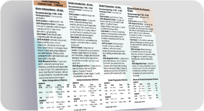 Youth Swimming Lessons Cont. - 3 Weeks Water Independence - 30 min. Recommended Age: 3 YRS - 8 YRS Participant Ratio: 1 instructor to 6 participants Pool Location: Family Pool (0ft - 4ft) Skills Required to Enter:1) Separate from a parent/guardian while taking part in group activities 2) Listen & take direction in a group setting Class Goals: To build basic water competency with minimal support. Skills Included: Safe water entry & exit, blowing bubbles, bobs, relaxed submersion, rolling from front to back floats, streamlines on front & back, flutter kicks on front & back, proper kickboard use, basic freestyle, finning on back, jumping into water with submersion, and basic water safety skills. Skills Required to Pass: 1) Jump into water, completely submerge head, resurface, and exit the pool using ladder or stairs 2) Start 10 ft. away from wall or stairs: front float for 5 seconds, roll over to a back float for 5 seconds, then swim back to start with minimal support Stroke Introduction - 45 min. Recommended Age: 5 YRS - 9 YRS Participant Ratio: 1 instructor to 6 students Pool Location: Family Pool & Lap Pool (5 to 7 feet) Skills Required to Enter: 1) Jump into water, completely submerge head, resurface, and exit the pool using ladder or stairs 2) Start 10 ft. away from wall or stairs: front float for 5 seconds, roll over to a back float for 5 seconds, then swim back to start with minimal support Class Goals: To refine freestyle, introduce backstroke, swim without any support, and build confidence entering the lap pool. Skills Included: Independent air recovery, rolling to back as air recovery for freestyle, longer distances for freestyle, basic backstroke, changing direction while swimming, feet-first deep water entries, introduction to treading, and basic water safety skills. Skills Required to Pass: 1) Jump into lap pool and return to the wall 2) Swim approx. 12 yards of freestyle independently 3) Swim approx. 12 yards of backstroke independently Water Independence (30mins) Session 7A Day Dates Times Cost M/W 10/6 - 10/22 4:00pm, 5:00pm $30 6:00pm T/TH 10/7 - 10/23 4:00pm, 5:00pm $30 6:00pm SAT 10/11 - 11/15 8:15am $30 Session 7B M/W 10/27 - 11/12 4:00pm, 5:00pm, $30 6:00pm T/TH 10/28 - 11/13 4:00pm, 5:00pm, $25* 6:00pm Activity Code: 752101 Stroke Introduction (45mins) Session 7A Day Dates Times Cost M/W 10/6 - 10/22 4:00pm, 5:00pm $30 6:00pm T/TH 10/7 - 10/23 4:00pm, 5:00pm $30 6:00pm SAT 10/11 - 11/15 9:00am $30 Session 7B M/W 10/27 - 11/12 4:00pm, 5:00pm, $30 6:00pm T/TH 10/28 - 11/13 4:00pm, 5:00pm, $25* 6:00pm Activity Code: 752102 Stroke Progression - 45 min. Recommended Age: 6 YRS - 12 YRS Participant Ratio: 1 instructor to 8 students Pool Location: Lap Pool (5 to 7 feet) Skills Required to Enter: 1) Jump into lap pool and return to the wall 2) Swim approx. 12 yards of freestyle independently 2) Swim approx. 12 yards of backstroke independently Class Goals: To refine basic swimming strokes to achieve proficiency (freestyle & backstroke), review treading, and to introduce elementary backstroke and breaststroke. Skills Included: Side breathing for freestyle to improve proficiency & endurance, refined backstroke, elementary backstroke, breaststroke, basic treading, and basic water safety skills. Skills Required to Pass: 1) Jump into lap pool, fully submerge, swim 12 yards of backstroke, turn around and swim freestyle with effective side breathing, then exit the pool 2) Swim 12 yards of elementary backstroke 3) Tread for 15 seconds with head above the water Advanced Stroke Development - 45 min. Recommended Age: 7 YRS - 12 YRS Participant Ratio: 1 instructor to 10 students Pool Location: Lap Pool (7 feet) Skills Required to Enter: 1) Jump into lap pool, fully submerge, swim 12 yards of backstroke, turn around and swim freestyle with effective side breathing, then exit the pool 2) Swim 12 yards of elementary backstroke 3) Tread for 15 seconds with head above the water Class Goals: To refine all basic swimming stokes and treading to proficiency, and to introduce sidestroke, butterfly, sitting and kneeling dives. Skills Included: Refined elementary backstroke & breaststroke, introduce sidestroke, proficient treading with sculling and eggbeater kick, butterfly, sitting & kneeling dives, and basic water safety skills. Skills Required to Pass: 1) Tread for 1 minute 2) 5 strokes of butterfly 3) 25 yards of breaststroke 4) 25 yards of freestyle w/ effective side breathing 5) 25 yards of backstroke 6) 25 yards of elementary backstroke Stroke Progression (45mins) Session 7A Day Dates Times Cost M/W 10/6 - 10/22 5:00pm $30 T/TH 10/7 - 10/23 6:00pm,7:00pm $30 SAT 10/11 - 11/15 9:00am $30 Session 7B M/W 10/27 - 11/12 5:00pm $30 T/TH 10/28 - 11/13 6:00pm, 7:00pm $25* Activity Code: 752103 Advanced Stroke Development (45mins) Session 7A Day Dates Times Cost M/W 10/6 - 10/22 6:00pm $30 T/TH 10/7 - 10/23 7:00pm $30 SAT 10/11 - 11/15 10:00am $30 Session 7B M/W 10/27 - 11/12 6:00pm $30 T/TH 10/28 - 11/13 7:00pm $25* Activity Code: 752104