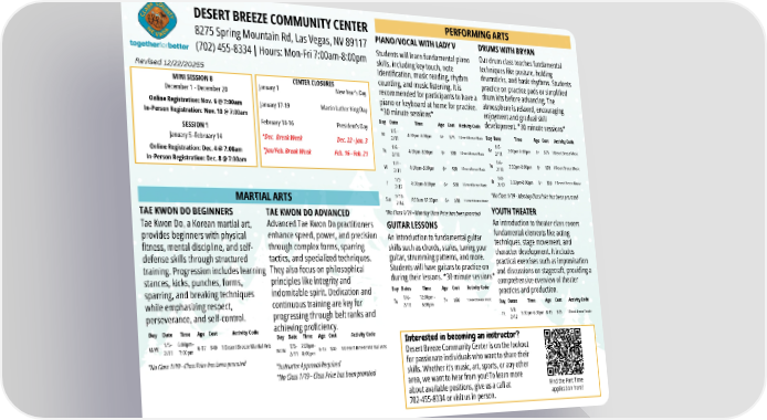 PERFORMING ARTS MARTIAL ARTS Day Date Time Age Cost Activity Code M/W 1/5- 2/11 6:00pm- 7:00pm 6-17 $40 1 Desert Breeze Martial Arts Day Date Time Age Cost Activity Code M/W 1/5- 2/11 7:00pm- 8:00pm 6-17 $40 1 Desert Breeze Martial Arts *Instructor Approval Required *No Class 1/19 - Class Price has been prorated Day Date Time Age Cost Activity Code M 1/5 - 2/11 4:00pm-8:00pm 6+ $75 1 Desert Breeze Music Tu 1/6 - 2/10 4:00pm-8:00pm 6+ $90 1 Desert Breeze Music W 1/7 - 2/11 4:00pm-8:00pm 6+ $90 1 Desert Breeze Music F 1/9- 2/13 4:00pm-8:00pm 6+ $90 1 Desert Breeze Music Sat 1/10- 2/14 8:30am-12:30pm 6+ $90 1 Desert Breeze Music Day Date Time Age Cost Activity Code M 1/5- 2/11 3:00pm-8:00pm 6+ $75 1 Desert Breeze Music Tu 1/6- 2/10 3:30pm-8:00pm 6+ $90 1 Desert Breeze Music Th 1/8- 2/12 3:30pm-8:00pm 6+ $90 1 Desert Breeze Music Day Dates Time Age Cost Activity Code Th 1/8- 2/12 5:30pm-6:30pm 8-15 $35 1 Desert Breeze Theater YOUTH THEATER An introduction to theater class covers fundamental elements like acting techniques, stage movement, and character development. It includes practical exercises such as improvisation and discussions on stagecraft, providing a comprehensive overview of theater practices and production. January 5 -February 14 8275 Spring Mountain Rd, Las Vegas, NV 89117 (702) 455-8334 | Hours: Mon-Fri 7:00am-8:00pm Tae Kwon Do, a Korean martial art, provides beginners with physical fitness, mental discipline, and self- defense skills through structured training. Progression includes learning stances, kicks, punches, forms, sparring, and breaking techniques while emphasizing respect, perseverance, and self-control. TAE KWON DO ADVANCED Advanced Tae Kwon Do practitioners enhance speed, power, and precision through complex forms, sparring tactics, and specialized techniques. They also focus on philosophical principles like integrity and indomitable spirit. Dedication and continuous training are key for progressing through belt ranks and achieving proficiency. DESERT BREEZE COMMUNITY CENTER PIANO/VOCAL WITH LADY V TAE KWON DO BEGINNERS DRUMS WITH BRYAN Students will learn fundamental piano skills, including key touch, note identification, music reading, rhythm counting, and music listening. It is recommended for participants to have a piano or keyboard at home for practice. *30 minute sessions* Our drum class teaches fundamental techniques like posture, holding drumsticks, and basic rhythms. Students practice on practice pads or simplified drum kits before advancing. The atmosphere is relaxed, encouraging enjoyment and gradual skill development. *30 minute sessions* SESSION 1 Online Registration: Dec. 4 @ 7:00am In-Person Registration: Dec. 8 @ 7:00am Revised 12/22/20255 CENTER CLOSURES January 1 New Year’s Day January 17-19 Martin Luther King Day February 14-16 President’s Day *Dec. Break Week Dec. 22 - Jan. 3 Interested in becoming an instructor? Desert Breeze Community Center is on the lookout for passionate individuals who want to share their skills. Whether it's music, art, sports, or any other area, we want to hear from you! To learn more about available positions, give us a call at 702-455-8334 or visit us in person. December 1 - December 20 MINI SESSION 8 Online Registration: Nov. 6 @ 7:00am In-Person Registration: Nov. 10 @ 7:00am *Jan/Feb. Break Week Feb. 16 - Feb. 21 Find the Part Time application here! Day Dates Time Age Cost Activity Code Tu 1/6- 2/10 12:00pm - 6:00pm 7+ $90 1 Desert Breeze Music GUITAR LESSONS An introduction to fundamental guitar skills such as chords, scales, tuning your guitar, strumming patterns, and more. Students will have guitars to practice on during their lessons. *30 minute sessions* *No Class 1/19 - Class Price has been prorated *No Class 1/19 - Monday Class Price has been prorated *No Class 1/19 - Monday Class Price has been prorated