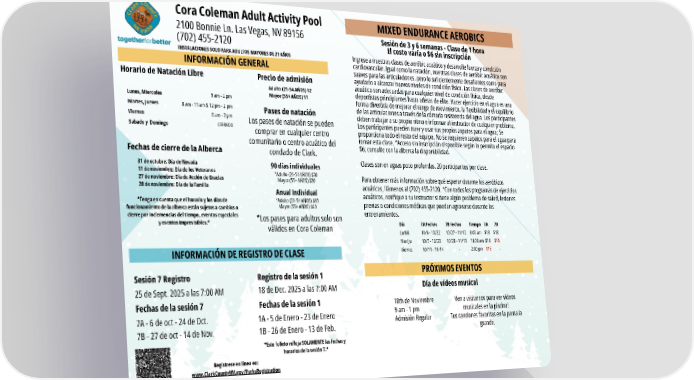 INFORMACIÓN GENERAL INFORMACIÓN DE REGISTRO DE CLASE MIXED ENDURANCE AEROBICS PRÓXIMOS EVENTOS Sesión 7 Registro 25 de Sept. 2025 a las 7:00 AM 7A - 6 de oct - 24 de Oct. 7B - 27 de oct - 14 de Nov. Fechas de la sesión 7 *Este folleto refleja SOLAMENTE las fechas y horarios de la sesión 7.* Ingrese a nuestras clases de aeróbic acuático y desarrolle fuerza y condición cardiovascular. Igual como la natación, nuestras clases de aeróbic acuático son suaves para las articulaciones, pero lo suficientemente desafiantes como para ayudarlo a alcanzar nuevos niveles de condición física. Las clases de aeróbic acuático son adecuadas para cualquier nivel de condición física, desde deportistas principiantes hasta atletas de élite. Hacer ejercicio en el agua es una forma divertida de mejorar el rango de movimiento, la flexibilidad y el equilibrio de las articulaciones a través de la cómoda resistencia del agua. Los participantes deben trabajar a su propio ritmo e informar al instructor de cualquier problema. Los participantes pueden traer y usar sus propios zapatos para el agua; Se proporciona todo el resto del equipo. No se requieren zapatos para el agua para tomar esta clase. *Acceso sin inscripción disponible según lo permita el espacio $6; consulte con la alberca la disponibilidad. Clases son en aguas poco profundas. 20 participantes por clase. Para obtener más información sobre qué esperar durante los aeróbicos acuáticos, llámenos al (702) 455-2120. *Con todos los programas de ejercicios acuáticos, notifique a su instructor si tiene algún problema de salud, lesiones previas o condiciones médicas que puedan agravarse durante los entrenamientos. Regístrese en línea en: www.ClarkCountyNV.gov/ParksRegistration Sesión de 3 y 6 semanas - Clase de 1 hora 2100 Bonnie Ln. Las Vegas, NV 89156 (702) 455-2120 Cora Coleman Adult Activity Pool Fechas de cierre de la Alberca Horario de Natación Libre Lunes, Miercoles 9 am - 2 pm Martes, Jueves Viernes 8 am - 2 pm Sabado y Domingo CERRADO *Tenga en cuenta que el horario y los días de funcionamiento de la alberca están sujetos a cambios o cierre por inclemencias del tiempo, eventos especiales y eventos imprevisibles.* 31 de octubre: Día de Nevada 11 de noviembre: Día de los Veteranos 27 de noviembre: Día de Acción de Gracias 28 de noviembre: Día de la Familia Pases de natación Adulto (21-54 AÑOS) $2 Mayor (55+ AÑOS) $1 Los pases de natación se pueden comprar en cualquier centro comunitario o centro acuático del condado de Clark. 90 días individuales *Adulto (21-54 AÑOS) $30 Mayor (55+ AÑOS) $20 Anual Individual *Adulto (21-54 AÑOS) $90 Mayor (55+ AÑOS) $60 Precio de admisión *Los pases para adultos solo son válidos en Cora Coleman Registro de la sesión 1 18 de Dec. 2025 a las 7:00 AM 1A - 5 de Enero - 23 de Enero 1B - 26 de Enero - 13 de Feb. Fechas de la sesión 1 El costo varía o $6 sin inscripción Día de vídeos musical Día 7A Fechas 7B Fechas Tiempo 7A 7B Lu/Mi 10/6 - 10/22 10/27 - 11/12 8:00 am $18 $18 Mar/Ju 10/7 - 10/23 10/28 - 11/13 11:00 am $18 $15 Viernes 10/11 - 11/14 - 2:00 pm $15 - 8 am - 11 am & 12 pm - 2 pm INSTALACIONES SOLO PARA ADULTOS MAYORES DE 21 AÑOS Ven a visitarnos para ver videos musicales en la piscina! Tus canciones favoritas en la pantalla grande. 18th de Noviembre 9 am - 1 pm Admisión Regular
