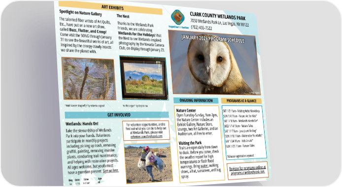 ONGOING INFORMATION PROGRAMS AT A GLANCE ART EXHIBITS GET INVOLVED 7050 Wetlands Park Ln, Las Vegas, NV 89122 (702) 455-7522 CLARK COUNTY WETLANDS PARK Nature Center Open Tuesday-Sunday, 9am-3pm, the Nature Center includes an Exhibit Gallery, Nature Store, Lounge, two Art Galleries, and an Auditorium, all free to enter. Visiting the Park Trails are open daily from dawn to dusk. Before you come, check the weather report for high temperatures or flash flood warnings. Bring water , walking shoes, a hat, sunscreen, and bug spray. JANUARY 2026 PROGRAM SCHEDULE JANUARY 2026 PROGRAM SCHEDULE SAT 1/3 11am - Visiting Artist Workshop SUN 1/4 11am - Nature Art for Kids* SAT 1/10 9am - Wetlands Hands On* WED 1/14 11am - Nature Tales SAT 1/17 8am - Java Jaunt Birding* SUN 1/18 11am - Watercolor for Adults* SAT 1/24 11am - Kids Create* SUN 1/25 11am - Nature Tales *Advance registration required. Register for programs online at programs.ccwetlandspark.com. Spotlight on Nature Gallery For volunteer opportunities, and to find out what you can do to help out at Wetlands Park, please visit volunteer.ccwetlandspark.com . The Nest The talented fiber artists of Art Quilts, Etc., have put on a new art show, called Buzz, Flutter, and Creep ! Come visit the SONG through January 31 to see the beautiful works of art, all inspired by the creepy crawly insects we share the planet with. Thanks to the Wetlands Park Friends, we are celebrating Wetlands for the Holidays ! Visit the Nest to see Wetlands-inspired photography by the Nevada Camera Club, on display through January 23. “Vivid Dancer Dragonfly” by Roberta Osgood © Philip Martini © Wetlands Wetlands: Hands On! Take the stewardship of Wetlands Park into your hands. Volunteers participate in monthly projects including picking up trash, removing graffiti, painting, removing invasive plants, conducting trail maintenance, and helping with restoration projects. All ages welcome, but youth must have a guardian present. Sign up here. Day Date Time Age Sa 1/10 9-11am All “Is This Vegas?” by Clayton Fox
