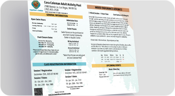GENERAL INFORMATION CLASS REGISTRATION INFORMATION MIXED ENDURANCE AEROBICS UPCOMING EVENTS Day 7A Dates 7B Dates Time 7A 7B M/W 10/6 - 10/22 10/27 - 11/12 8:00 am $18 $18 T/Th 10/7 - 10/23 10/28 - 11/13 11:00 am $18 $15 Fri 10/11 - 11/14 - 2:00 pm $15 - Session 7 Registration September 25th, 2025 @7:00 AM 7A - Oct. 6th - Oct. 24th 7B - Oct. 27th - Nov. 14th Session 7 Dates *This brochure reflects dates/times for session 7 ONLY.* Jump right into our water aerobics classes and build cardiovascular fitness and strength. Just like swimming, our water aerobics classes are easy on your joints, yet challenging enough to help you reach new levels of fitness. Water aerobics classes are suitable for any fitness level, from beginning exercisers through elite athletes. Working out in the water is a fun way to improve your joint range of motion, flexibility, and balance through the comfortable resistance of water. Participants should work at their own pace and let the instructor know of any problems. Participants may bring and use their own water shoes; all other equipment is provided. Water shoes are not required to take this class. *Drop-ins available as space permits $6 – please check with the pool for availability. Classes held in Shallow Water. 20 participants per class. For more information about what to expect during Water Aerobics, please call us at (702) 455-2120. *With all water exercise programs, please notify your instructor if you have any health concerns, previous injuries or medical conditions that may be aggravated during workouts. Register Online At: www.ClarkCountyNV.gov/ParksRegistration 2100 Bonnie Ln. Las Vegas, NV 89156 (702) 455-2120 Cora Coleman Adult Activity Pool Pool Closure Dates Open Swim Hours Monday, Wednesday 9 am - 2 pm Tuesday, Thursday 8 am - 11 am & 12 pm - 2 pm Friday 8 am - 2 pm Saturday & Sunday CLOSED *Please note that pool hours/days of operation are subject to change/closure for inclement weather, special events, and unforeseeable events.* October 31st - Nevada Day November 11 - Veterans Day th November 27 - Thanksgiving TH November 28 - Family Day th Swim Passes Swim Passes can be purchased at any Clark County Community Center or Aquatic Center. Admission Fees *Adult Pool Passes are only good at Cora Coleman Pool Session 1 Registration December 18th, 2025 @7:00 AM Session 1 Dates Cost Varies or $6 Drop-In 3 Week Session - 1 Hour Class Adult (21-54 YRS) $2 Senior (55+ YRS) $1 90 Day Individual *Adult (21-54 YRS) $30 Senior (55+ YRS) $20 Annual Individual *Adult (21-54 YRS) $90 Senior (55+ YRS) $60 ADULT FACILITY ONLY 21 YEARS OF AGE AND UP 1A - Jan. 5th - Jan. 23rd 1B - Jan. 26th - Feb. 13th Music Video Day November 18th 9 am - 1 pm Regular Admission Join us for music videos at the pool! Your favorite tunes on the big screen