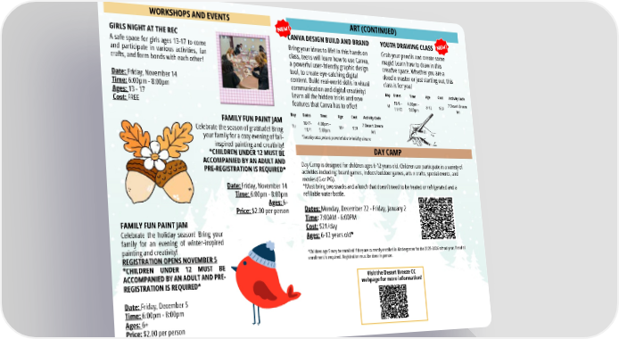 WORKSHOPS AND EVENTS DAY CAMP Day Camp is designed for children ages 6-12 years old. Children can participate in a variety of activities including: board games, indoor/outdoor games, arts n crafts, special events, and movies (G or PG). *Must bring two snacks and a lunch that doesn’t need to be heated or refrigerated and a refillable water bottle. Dates: Monday, December 22 - Friday, January 2 Time: 7:00AM - 6:00PM Cost: $21/day Ages: 6-12 years old* *Children age 5 may be enrolled if they are currently enrolled in Kindergarten for the 2025-2026 school year. Proof of enrollment is required. Registration must be done in person. ART (CONTINUED) Day Dates Time Age Cost Activity Code Tu 10/7- 11/4 4:00pm - 5:00pm 18+ $30 7 Desert Breeze Art YOUTH DRAWING CLASS Day Dates Time Age Cost Activity Code M 10/6 - 11/12 4:00pm - 5:00pm 8-12 $30 7 Desert Breeze Art Bring your ideas to life! In this hands on class, teens will learn how to use Canva, a powerful user-friendly graphic design tool, to create eye-catching digital content. Build real-world skills in visual communication and digital creativity! Learn all the hidden tricks and new features that Canva has to offer! CANVA DESIGN BUILD AND BRAND FAMILY FUN PAINT JAM Celebrate the season of gratitude! Bring your family for a cozy evening of fall- inspired painting and creativity! *CHILDREN UNDER 12 MUST BE ACCOMPANIED BY AN ADULT AND PRE-REGISTRATION IS REQUIRED* Date: Friday, November 14 Time: 6:00pm - 8:00pm Ages: 6+ Price: $2.00 per person GIRLS NIGHT AT THE REC A safe space for girls ages 13-17 to come and participate in various activities, fun crafts, and form bonds with each other! Date: Friday, November 14 Time: 6:00pm - 8:00pm Ages: 13 - 17 Cost: FREE Visit the Desert Breeze CC webpage for more information! *Tuesday class price is prorated due to holiday closure Grab your pencils and create some magic! Learn how to draw in this creative space. Whether you are a doodle master or just starting out, this class is for you! FAMILY FUN PAINT JAM Celebrate the holiday season! Bring your family for an evening of winter-inspired painting and creativity! REGISTRATION OPENS NOVEMBER 5 *CHILDREN UNDER 12 MUST BE ACCOMPANIED BY AN ADULT AND PRE- REGISTRATION IS REQUIRED* Date: Friday, December 5 Time: 6:00pm - 8:00pm Ages: 6+ Price: $2.00 per person