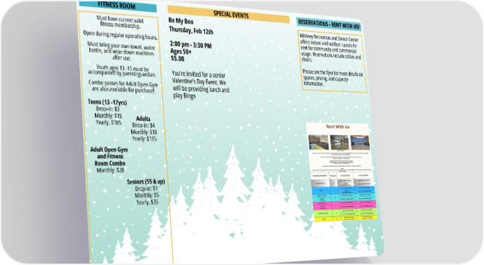 RESERVATIONS - RENT WITH US! Must have current valid fitness membership. Open during regular operating hours. Must bring your own towel, water bottle, and wipe down machines after use. Youth ages 13 -15 must be accompanied by parent/guardian. Combo passes for Adult Open Gym are also available for purchase! Teens (13 -17yrs) Drop-in: $3 Monthly: $15 Yearly: $105 Adults Drop-in: $4 Monthly: $16 Yearly: $115 Adult Open Gym and Fitness Room Combo Monthly: $28 Seniors (55 & up) Drop-in: $1 Monthly: $5 Yearly: $35 SPECIAL EVENTS Whitney Recreation and Senior Center offers indoor and outdoor spaces for rent for community and commercial usage. Reservations include tables and chairs. Please see the flyer for more details on spaces, pricing, and capacity information. FITNESS ROOM Be My Boo Thursday, Feb 12th 2:00 pm - 3:30 PM Ages 50+ $5.00 You’re invited for a senior Valentine’s Day Event. We will be providing lunch and play Bingo
