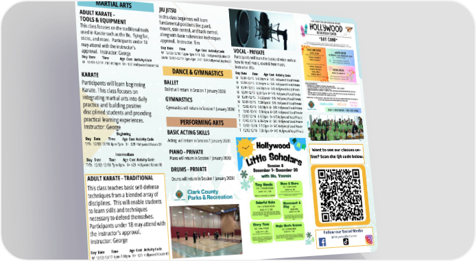 Day Date Time Age Cost Activity Code W 12/02-12/18 12pm-1pm 7-11 $22 Hollywood Jiujitsu 01 M/W 12/01-12/17 6pm-7pm 7-11 $29 Hollywood Jiujitsu 02 DANCE & GYMNASTICS PERFORMING ARTS BASIC ACTING SKILLS Acting will return in Session 1 January 2026! Follow our Social Media @HollywoodRecCenter MARTIAL ARTS ADULT KARATE - TOOLS & EQUIPMENT This class focuses on the traditional tools used in Karate such as the Bo, flying fan, sticks, and more. Participants under 18 may attend with the instructor's approval. Instructor: George Day Date Time Age Cost Activity Code W 12/03-12/17 7:00-8:00pm 18+ $22 Hollywood Karate 04 Beginning Day Date Time Age Cost Activity Code T/Th 12/02-12/18 6pm-7pm 6+ $29 Hollywood Karate 01 Intermediate Day Date Time Age Cost Activity Code T/Th 12/02-12/18 7pm-8pm 6+ $29 Hollywood Karate 02 ADULT KARATE - TRADITIONAL This class teaches basic self-defense techniques from a blended array of disciplines. This will enable students to learn skills and techniques necessary to defend themselves. Participants under 18 may attend with the instructor's approval. Instructor: George Day Date Time Age Cost Activity Code W 12/02-12/17 6pm-7:00pm 18+ $29 Hollywood Karate 03 Participants will learn beginning Karate. This class focuses on integrating martial arts into daily practice and building positive disciplined students and providing practical learning experiences. Instructor: George KARATE JIU JITSU In this class beginners will learn fundamental positions like guard, mount, side control, and back control, along with basic submission techniques approval. Instructor: Tim GYMNASTICS BALLET VOCAL - PRIVATE Participants will learn the basics of voice such as how to read music, count & hear music. Instructor: Ella Day Date Time Age Cost Activity Code M 12/01-12/15 5-5:30pm 6+ $45 Hollywood Vocal Private M 12/01-12/15 5:30-6pm 6+ $45 Hollywood Vocal Private M 12/01-12/15 6-6:30pm 6+ $45 Hollywood Vocal Private M 12/01-12/15 6:30-7pm 6+ $45 Hollywood Vocal Private M 12/01-12/15 7-7:30pm 6+ $45 Hollywood Vocal Private M 12/01-12/15 7:30-8pm 6+ $45 Hollywood Vocal Private T 12/02-12/16 5-5:30pm 6+ $45 Hollywood Vocal Private T 12/02-12/16 5:30-6pm 6+ $45 Hollywood Vocal Private T 12/02-12/16 6-6:30pm 6+ $45 Hollywood Vocal Private T 12/02-12/16 6:30-7pm 6+ $45 Hollywood Vocal Private T 12/02- 12/16 7-7:30pm 6+ $45 Hollywood Vocal Private T 12/02-12/16 7:30-8pm 6+ $45 Hollywood Vocal Private DRUMS - PRIVATE PIANO - PRIVATE Piano will return in Session 1 January 2026! Drums will return in Session 1 January 2026! Ballet will return in Session 1 January 2026! Gymnastics will return in Session 1 January 2026! Want to see our classes on- line? Scan the QR code below.