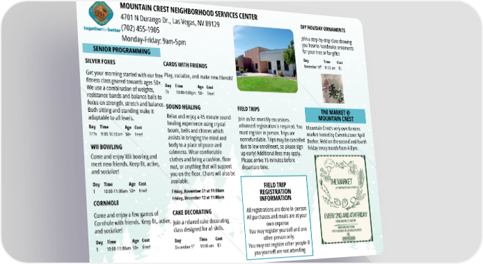 SENIOR PROGRAMMING 4701 N Durango Dr., Las Vegas, NV 89129 (702) 455-1905 Monday-Friday: 9am-5pm THE MARKET @ MOUNTAIN CREST MOUNTAIN CREST NEIGHBORHOOD SERVICES CENTER SILVER FOXES Get your morning started with our free fitness class geared towards ages 50+. We use a combination of weights, resistance bands and balance balls to focus on strength, stretch and balance. Both sitting and standing make it adaptable to all levels. Day Time Age Cost T/Th 9:00-10:00am 50+ Free! WII BOWLING Come and enjoy Wii bowling and meet new friends. Keep fit, active, and socialize! CARDS WITH FRIENDS Play, socialize, and make new friends! SOUND HEALING Relax and enjoy a 45 minute sound healing experience using crystal bowls, bells and chimes which assists in bringing the mind and body to a place of peace and calmness. Wear comfortable clothes and bring a cushion, floor mat, or anything that will support you on the floor. Chairs will also be available. FIELD TRIPS Join us for monthly excursions. advanced registration is required. You must register in person. Trips are nonrefundable. Trips may be cancelled due to low enrollment, so please sign up early! Additional fees may apply. Please arrive 15 minutes before departure time. All registrations are done in-person All purchases and meals are at your own expense You may register yourself and one other person only. You may not register other people if you yourself are not attending CORNHOLE Come and enjoy a few games of Cornhole with friends. Keep fit, active, and socialize! FIELD TRIP REGISTRATION INFORMATION Day Time Age Cost T 10:00-11:00am 50+ Free! Day Time Age Cost T 10:00-11:00am 50+ Free! Day Time Age Cost Th 10:00-1:00pm 50+ Free! Friday, November 21 at 11:00am Friday, December 12 at 11:00am Mountain Crest’s very own farmers market hosted by Commissioner April Becker. Held on the second and fourth Friday every month from 4-8pm. CAKE DECORATING Join a relaxed cake decorating class designed for all skills. Day Time Cost December 5 11:00 am $3 th DIY HOLIDAY ORNAMENTS Day Time Cost November 19 11:00 am $3 th Join a step-by-step class showing you how to handmake ornaments for your tree or for gifts!