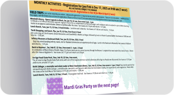 Keith Zalinger, a mentalist and mind reader at West Charleston Library, Sun, Feb 22, $2 Van, Free event 4 - 5 pm, $ Food Step into the world of the extraordinary with Keith Zalinger, a mind-reader, mentalist, and hypnotist who blurs the line between reality, the supernatural, and imagination. Dinner after the show at the Yard House Van leaves at 3:15 pm and returns ~ 7:00 pm. Lunch Bunch, Tues, Feb 24, $2 Van, $ Food - Cheongdam Food Hall. Van leaves at 11:00 am and returns at ~1:30 pm. Join us for monthly excursions. Advanced registration is required via in person lottery system. Trips are non refundable. Additional fees may apply, cash for tickets due at time of registration. Please arrive at least 15 minutes before field trip departure time or you may lose your spot. MONTHLY ACTIVITIES - Registration for Jan/Feb is Dec 17, 2025 at 9:00 am (1 west) Celebrate a rich African-American operatic legacy to honor the accomplishments of beloved singers and composers who triumphed in spite of often daunting routes to acceptance and inclusion. Dinner at Jollibee after the show. Van leaves at 2:15 pm and returns ~ 6:15 pm. Windmill Library - Opera Legends in Black, Sat, Jan 10, $2 van, free event 3 pm - 4 pm ALL ACTIVITIES SUBJECT TO CHANGE Next brochure is out Feb 09- Registration is Feb 18 for March/April (2 west) FIELD TRIPS Lunch Bunch, Tues, Jan 13, $2 Van, $ Food/drinks - Sunshine and Tailwinds. Van leaves at 11:00 am and returns ~ 1:30 pm. Thrift Shopping and lunch, Thu, Jan 15, $2 Van, Free Event $ Food Join us to shop at 2 thrift stores (Desert Industries and Good Will) in North Las Vegas, followed by lunch at Hibachi Supreme Buffet, Van leaves at 10:00 am and returns ~ 2:00 pm. Infinity Museum at Boulevard Mall, Tue, Jan 20, $2 Van, $28, $ Food Step into mind-bending infinity rooms, mirror illusions & immersive art experiences for all ages. Lunch in the food court afterwards. Van leaves at 10:00 am and returns ~1:45 pm. Bach to Beyonce`, Sat, Feb 07, $2 Van, Free event 3 - 4 pm , $ Food In celebration of Black History Month, Vegas City Opera takes you on a vocal journey through the Beyonce' songbook that was inspired by classical music. Dinner after the show at Applebee’s. Van leaves at 2:15 pm and returns at 6:30 pm. Ice Age Fossil State Park, Thur, Feb 19, $2 Van, Free event, The all-new Ice Age Fossils State Park brims with one of the largest and most varied collections of Ice Age-era fossils ever discovered. Van leaves at 12:15 pm and returns around 3:15 pm. Mardi Gras Party on the next page!