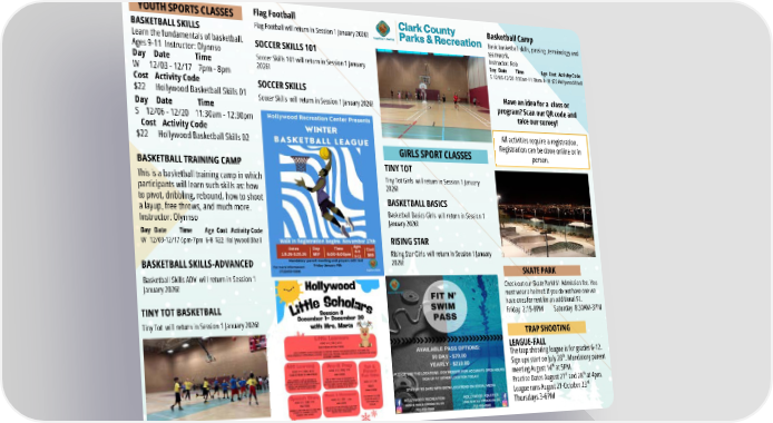 SKATE PARK Check out our Skate Park! $1 Admission fee. You must wear a helmet! If you do not have one we have ones for rent for an additional $1. Friday 2:15-8PM Saturday 8:30AM-3PM GIRLS SPORT CLASSES BASKETBALL BASICS RISING STAR TINY TOT YOUTH SPORTS CLASSES BASKETBALL SKILLS Learn the fundamentals of basketball. Ages 9-11 Instructor: Olynnso Day Date Time W 12/03 - 12/17 7pm - 8pm Cost Activity Code $22 Hollywood Basketball Skills 01 BASKETBALL SKILLS-ADVANCED BASKETBALL TRAINING CAMP This is a basketball training camp in which participants will learn such skills as: how to pivot, dribbling, rebound, how to shoot a layup, free throws, and much more. Instructor: Olynnso Day Date Time Age Cost Activity Code W 12/03-12/17 6pm-7pm 6-8 $22 Hollywood Bball TINY TOT BASKETBALL Day Date Time S 12/06 - 12/20 11:30am - 12:30pm Cost Activity Code $22 Hollywood Basketball Skills 02 SOCCER SKILLS 101 SOCCER SKILLS Flag Football Basketball Camp Basic basketball skills, passing ,terminology and teamwork. Instructor: Rob Day Date Time Age Cost Activity Code S 12/06-12/20 8:30am-11:30am 8-18 $22 Hollywood bball Have an idea for a class or program? Scan our QR code and take our survey! All activities require a registration. Registration can be done online or in person. TRAP SHOOTING The trap shooting league is for grades 6-12. Sign ups start on July 28 . Mandatory parent meeting August 14 at 5PM. th th Practice Dates August 21 and 28 at 4pm. st th League runs August 21-October 23 rd Thursdays 3-6PM LEAGUE-FALL Tiny Tot Girls will return in Session 1 January 2026! Basketball Basics Girls will return in Session 1 January 2026! Rising Star Girls will return in Session 1 January 2026! Tiny Tot will return in Session 1 January 2026! Basketball Skills ADV will return in Session 1 January 2026! Soccer Skills will return in Session 1 January 2026! Soccer Skills 101 will return in Session 1 January 2026! Flag Football will return in Session 1 January 2026!