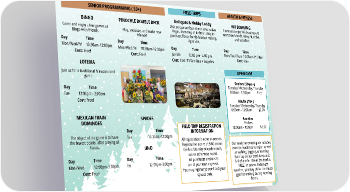 FIELD TRIPS OUTDOOR WALKING TRAIL HEALTH & FITNESS Come and enjoy a few games of Bingo with friends. Day Time Mon/Wed/Fri 10:30am-12:00pm Cost: Free! PINOCHLE DOUBLE DECK Play, socialize, and make new friends! Day Time Mon/Tue/Thurs 10:00am-11:30am Cost: Free Our newly renovated park includes exercise machines to enjoy as well as walking, jogging, or running. Each lap on our track is equal to 1/4 of a mile. Use of the track is FREE. In case of inclement weather, you may utilize the indoor gym for walking during morning hours. FIELD TRIP REGISTRATION INFORMATION All registration is done in-person. Registration opens at 8:00 am on the last Monday of each month, unless otherwise noted. All purchases and meals are at your own expense. You may register yourself and your spouse only. The object of the game is to have the fewest points, after playing all hands. WII BOWLING Come and enjoy Wii bowling and meet new friends. Keep fit, active, and socialize! Day Time Mon/Wed/Fri 10:30am-12:00pm Cost: Free! SENIOR PROGRAMMING ( 50+) BINGO LOTERIA Join us for a traditional Mexican card game. Day Time Tue 12:00pm - 2:00pm Cost: Free! MEXICAN TRAIN DOMINOES Day Time Mon/Wed 12:00pm-3:00pm Cost: Free! SPADES UNO Day Time Fri 12:00pm-3:00pm Day Time Tue 10:30am-12:00pm Antiques & Hobby Lobby Visit unique antique stores around Las Vegas, then stop at Hobby Lobby to purchase fleece for tie-blanket making. Ages 50+. Day Time Jan 6th 12:00 pm - 4:00 pm Cost: Cost: $3 Van Ride + Supplies OPEN GYM Seniors (50yrs+) Tuesday/ Wednesday/Thursday 8:00am - 12:00pm Free Adults (18+ ) Tuesday/ Wednesday/Thursday 8:00am - 12:00pm $2.00 Families Fridays 10:00am - 1:00pm $2.00