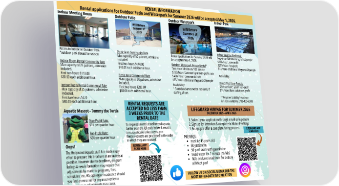 Indoor Meeting Room Outdoor Waterpark Rental applications for Summer 2026 will be accepted May 1, 2026. Outdoor Waterpark Private Rental* Two-Hour Minimum/100 people $200/hour: Community or non-profit rate $400/hour: Commercial rate $15/hour-additional lifeguard/20people Availability: * 3-week advance notice required, if staffing allows Indoor Pool Indoor Pool Facility Rental Two-Hour Minimum/ up to100 people $100/hour: non-profit $200/hour: for-profit $15/hour-additional lifeguard/20people Availability: Indoor Pool Lane Rentals $3/hour/lane: youth non-profit $10/hour/lane: adult non-profit **Requires Liability Insurance Call for availability (702-455-8508) RENTAL REQUESTS ARE ACCEPTED NO LESS THAN 3 WEEKS PRIOR TO THE RENTAL DATE RENTAL APP SCAN HERE Picnic Area Community Rate Max capacity of 50 patrons, admission included. First two hours $140.00 $40.00 each additional hour. Picnic Area Commercial Rate Max capacity of 50 patrons, admission included. First two hours $280.00 $80.00 each additional hour. RENTAL INFORMATION Rental applications for Outdoor Patio and Waterpark for Summer 2026 will be accepted May 1, 2026. FOLLOW US ON SOCIAL MEDIA FOR THE MOST UP-TO-DATE INFORMATION Will Return Summer of 2026 LIFEGUARD HIRING FOR SUMMER 2026 DECEMBER 2025 - APRIL 2026 1.Submit your application through email or in person 2.Sign up for interview & complete in Water Pre Reqs 3.Accept job offer & complete hiring process LIFEGUARD APP SCAN HERE To request a rental at Hollywood Aquatic Center scan the QR code below & email it to [email protected]. Rental requests are processed in the order in which they are received. Access to Indoor or Outdoor Pool *outdoor pool closed for season Indoor Room Rental Community Rate Max capacity of 25 patrons, admission included. First two hours $110.00 $20.00 each additional hour. Indoor Room Rental Commercial Rate Max capacity of 25 patrons, admission included. First two hours $220 $40.00 each additional hour Aquatic Mascot - Tommy the Turtle Non-Profit Rate: $15 per quarter hour For-Profit Rate: $30 per quarter hour Outdoor Patio Oops! The Hollywood Aquatic staff has made every effort to prepare this brochure as accurately as possible. However due to deadlines, program listings & new information may require that adjustments be made to programs, fees, schedules, etc. We apologize in advance should you find an error or for any inconvenience these errors or adjustments may cause. Will Return Summer of 2026 PRE REQS: must be 15 years old 50 yard swim 50 yard swim with guard tube tread water for 1 minute (no h&s) 10lb brick retrieval from the bottom of 9 foot pool
