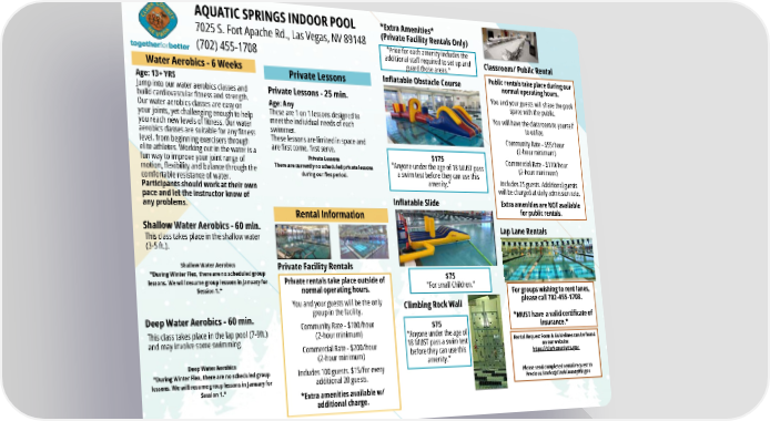 7025 S. Fort Apache Rd., Las Vegas, NV 89148 (702) 455-1708 AQUATIC SPRINGS INDOOR POOL Private Lessons Rental Information Private rentals take place outside of normal operating hours. You and your guests will be the only group in the facility. Community Rate - $100/hour (2-hour minimum) Commercial Rate - $200/hour (2-hour minimum) Includes 100 guests. $15/for every additional 20 guests. *Extra amenities available w/ additional charge. Private Facility Rentals *Price for each amenity includes the additional staff required to set up and guard those areas.* $175 *Anyone under the age of 18 MUST pass a swim test before they can use this amenity.* $75 *For small Children.* $75 *Anyone under the age of 18 MUST pass a swim test before they can use this amenity.* Water Aerobics - 6 Weeks Public rentals take place during our normal operating hours. You and your guests will share the pool space with the public. You will have the classroom to yourself to utilize. Community Rate - $55/hour (2-hour minimum) Commercial Rate - $110/hour (2-hour minimum) Includes 25 guests. Additional guests will be charged at daily admission rate. Extra amenities are NOT available for public rentals. Classroom/ Public Rental For groups wishing to rent lanes, please call 702-455-1708. *MUST have a valid certificate of insurance.* Rental Request Form & Guidelines can be found on our website: https://clarkcountynv.gov Please send completed rental request to [email protected] Deep Water Aerobics - 60 min. This class takes place in the lap pool (7-9ft.) and may involve some swimming. Deep Water Aerobics *During Winter Flex, there are no scheduled group lessons. We will resume group lessons in January for Session 1.* Private Lessons - 25 min. Age: Any These are 1 on 1 lessons designed to meet the individual needs of each swimmer. These lessons are limited in space and are first come, first serve. Private Lessons There are currently no scheduled private lessons during our flex period. *Extra Amenities* (Private Facility Rentals Only) Inflatable Obstacle Course Inflatable Slide Climbing Rock Wall Shallow Water Aerobics - 60 min. This class takes place in the shallow water (3-5 ft.). Shallow Water Aerobics *During Winter Flex, there are no scheduled group lessons. We will resume group lessons in January for Session 1.* Jump into our water aerobics classes and build cardiovascular fitness and strength. Our water aerobics classes are easy on your joints, yet challenging enough to help you reach new levels of fitness. Our water aerobics classes are suitable for any fitness level, from beginning exercisers through elite athletes. Working out in the water is a fun way to improve your joint range of motion, flexibility and balance through the comfortable resistance of water. Participants should work at their own pace and let the instructor know of any problems. Age: 13+ YRS Lap Lane Rentals