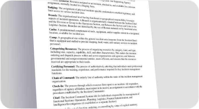 Clark County EOP Basic Plan Appendix B. Acronyms and Glossary Assistant: Title for subordinates of principal Command Staff positions. The title indicates a level of technical capability, qualifications, and responsibility subordinate to the primary positions. Assistants may also be assigned to Unit Leaders. Assisting Agency: An agency or organization providing personnel, services, or other resources to the agency with direct responsibility for incident management. See Supporting Agency. Available Resource: Resource assigned to an incident, checked in, and available for a mission assignment, normally located in a Staging Area. Badging: The assignment of physical incident-specific credentials to establish legitimacy and limit access to various incident sites. Branch: The organizational level having functional or geographical responsibility for major aspects of incident operations. A Branch is organizationally situated between the Section Chief and the Division or Group in the Operations Section, and between the Section and Units in the Logistics Section. Branches are identified by the use of Roman numerals or by functional area. Cache: A predetermined complement of tools, equipment, and/or supplies stored in a designated location, available for incident use. Camp: A geographical site within the general incident area (separate from the Incident Base) that is equipped and staffed to provide sleeping, food, water, and sanitary services to incident personnel. Categorizing Resources: The process of organizing resources by category, kind, and type, including size, capacity, capability, skill, and other characteristics. This makes the resource ordering and dispatch process within and across organizations and agencies, and between governmental and nongovernmental entities, more efficient, and ensures that the resources received are appropriate to their needs. Certifying Personnel: The process of authoritatively attesting that individuals meet professional standards for the training, experience, and performance required for key incident management functions. Chain of Command: The orderly line of authority within the ranks of the incident management organization. Check-In: The process through which resources first report to an incident. All responders, regardless of agency affiliation, must report in to receive an assignment in accordance with the procedures established by the Incident Commander. Chief: The Incident Command System title for individuals responsible for management of functional Sections: Operations, Planning, Logistics, Finance/Administration, and Intelligence/Investigations (if established as a separate Section). Command: The act of directing, ordering, or controlling by virtue of explicit statutory, regulatory, or delegated authority. Command Staff: The staff who report directly to the Incident Commander, including the Public Information Officer, Safety Officer, Liaison Officer, and other positions as required. They may have an assistant or assistants, as needed. D-4