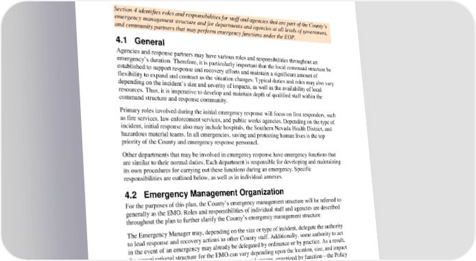 Clark County EOP Basic Plan 4. Roles and Responsibilities 4 Roles and Responsibilities Section 4 identifies roles and responsibilities for staff and agencies that are part of the County’s emergency management structure and for departments and agencies at all levels of government, and community partners that may perform emergency functions under the EOP. 4.1 General Agencies and response partners may have various roles and responsibilities throughout an emergency’s duration. Therefore, it is particularly important that the local command structure be established to support response and recovery efforts and maintain a significant amount of flexibility to expand and contract as the situation changes. Typical duties and roles may also vary depending on the incident’s size and severity of impacts, as well as the availability of local resources. Thus, it is imperative to develop and maintain depth of qualified staff within the command structure and response community. Primary roles involved during the initial emergency response will focus on first responders, such as fire services, law enforcement services, and public works agencies. Depending on the type of incident, initial response also may include hospitals, the Southern Nevada Health District, and hazardous material teams. In all emergencies, saving and protecting human lives is the top priority of the County and emergency response personnel. Other departments that may be involved in emergency response have emergency functions that are similar to their normal duties. Each department is responsible for developing and maintaining its own procedures for carrying out these functions during an emergency. Specific responsibilities are outlined below, as well as in individual annexes. 4.2 Emergency Management Organization For the purposes of this plan, the County’s emergency management structure will be referred to generally as the EMO. Roles and responsibilities of individual staff and agencies are described throughout the plan to further clarify the County’s emergency management structure. The Emergency Manager may, depending on the size or type of incident, delegate the authority to lead response and recovery actions to other County staff. Additionally, some authority to act in the event of an emergency may already be delegated by ordinance or by practice. As a result, the organizational structure for the EMO can vary depending upon the location, size, and impact of the incident. The EMO is divided into two general groups, organized by function—the Policy Group and Emergency Response Agencies. 4-1