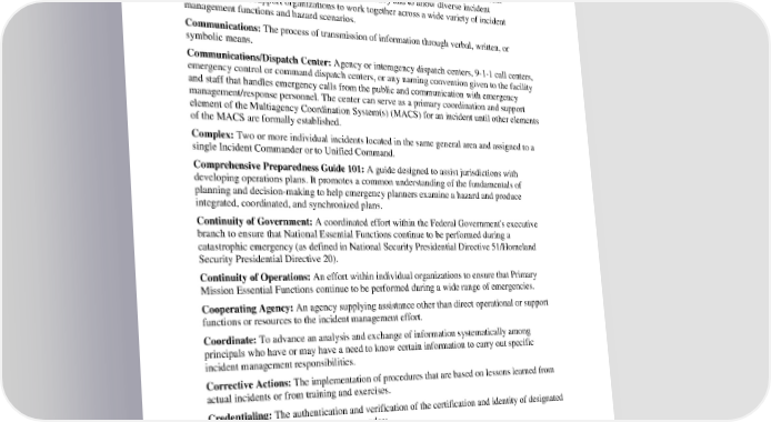 Clark County EOP Basic Plan Appendix B. Acronyms and Glossary Common Operating Picture: An overview of an incident by all relevant parties that provides incident information enabling the Incident Commander/Unified Command and any supporting agencies and organizations to make effective, consistent, and timely decisions. Common Terminology: Normally used words and phrases-avoiding the use of different words/phrases for same concepts-to ensure consistency and to allow diverse incident management and support organizations to work together across a wide variety of incident management functions and hazard scenarios. Communications: The process of transmission of information through verbal, written, or symbolic means. Communications/Dispatch Center: Agency or interagency dispatch centers, 9-1-1 call centers, emergency control or command dispatch centers, or any naming convention given to the facility and staff that handles emergency calls from the public and communication with emergency management/response personnel. The center can serve as a primary coordination and support element of the Multiagency Coordination System(s) (MACS) for an incident until other elements of the MACS are formally established. Complex: Two or more individual incidents located in the same general area and assigned to a single Incident Commander or to Unified Command. Comprehensive Preparedness Guide 101: A guide designed to assist jurisdictions with developing operations plans. It promotes a common understanding of the fundamentals of planning and decision-making to help emergency planners examine a hazard and produce integrated, coordinated, and synchronized plans. Continuity of Government: A coordinated effort within the Federal Government's executive branch to ensure that National Essential Functions continue to be performed during a catastrophic emergency (as defined in National Security Presidential Directive 51/Homeland Security Presidential Directive 20). Continuity of Operations: An effort within individual organizations to ensure that Primary Mission Essential Functions continue to be performed during a wide range of emergencies. Cooperating Agency: An agency supplying assistance other than direct operational or support functions or resources to the incident management effort. Coordinate: To advance an analysis and exchange of information systematically among principals who have or may have a need to know certain information to carry out specific incident management responsibilities. Corrective Actions: The implementation of procedures that are based on lessons learned from actual incidents or from training and exercises. Credentialing: The authentication and verification of the certification and identity of designated incident managers and emergency responders. Critical Infrastructure: Assets, systems, and networks, whether physical or virtual, so vital to the United States that the incapacitation or destruction of such assets, systems, or networks would have a debilitating impact on security, national economic security, national public health or safety, or any combination of those matters. D-5