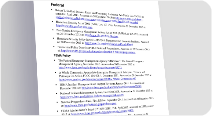 Clark County EOP Basic Plan A References Appendix A. References Federal Robert T. Stafford Disaster Relief and Emergency Assistance Act (Public Law 93-288) as amended, April 2013. Accessed on 20 December 2013 at: http://www.fema.gov/robert-t- stafford-disaster-relief-and-emergency-assistance-act-public-law-93-288-amended Homeland Security Act of 2002 (Public Law 107-296). Accessed on 20 December 2013 at: http://www.dhs.gov/key-dhs-laws Post-Katrina Emergency Management Reform Act of 2006 (Public Law 109-295). Accessed on 20 December 2013 at: http://www.dhs.gov/key-dhs-laws Homeland Security Policy Directive/HSPD-5: Management of Domestic Incidents. Accessed on 20 December 2013 at: http://www.fas.org/irp/offdocs/nspd/hspd-5.html Presidential Policy Directive/PPD-8: National Preparedness. Accessed on 20 December 2013 at: http://www.dhs.gov/presidential-policy-directive-8-national-preparedness FEMA Policy The Federal Emergency Management Agency Publication 1: The Federal Emergency Management Agency, November 2010. Accessed on 20 December 2013 at: http://www.fema.gov/media-library/assets/documents/25272 A Whole Community Approach to Emergency Management: Principles, Themes, and Pathways for Action, FDOC 104-008-1, December 2011. Accessed on 20 December 2013 at: http://www.emd.wa.gov/about/documents/FEMA_Whole_Community.pdf FEMA Incident Management and Support Keystone, January 2011. Accessed on 20 December 2013 at: http://www.fema.gov/media-library/assets/documents/26688 National Incident Management System, December 2008. Accessed on 20 December 2013 at: http://www.fema.gov/national-incident-management-system National Preparedness Goal, First Edition, September 2011. Accessed on 20 December 2013 at: http://www.fema.gov/national-preparedness-goal FEMA Administrator’s Intent (FY 2015-2019). Pub. April 2013. Accessed on 20 December 2013 at: http://www.fema.gov/media-library/assets/documents/31808 FEMA Strategic Plan, FY 2011-2014, FEMA P-806, February 2011. Accessed on 20 December 2013 at: http://www.fema.gov/fy-2011-2014-strategic-plan Crisis Response and Disaster Resilience 2030: Forging Strategic Action in an Age of Uncertainty, January 2012. Accessed on 20 December 2013 at: https://www.fema.gov/media- library/assets/documents/24174 C-1