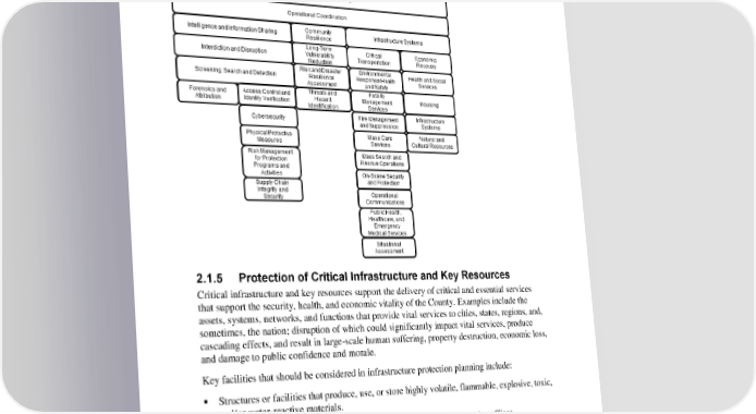 Clark County EOP Basic Plan 2. Situation and Assumptions Figure 2-1 Core Capabilities List 2.1.5 Protection of Critical Infrastructure and Key Resources Critical infrastructure and key resources support the delivery of critical and essential services that support the security, health, and economic vitality of the County. Examples include the assets, systems, networks, and functions that provide vital services to cities, states, regions, and, sometimes, the nation; disruption of which could significantly impact vital services, produce cascading effects, and result in large-scale human suffering, property destruction, economic loss, and damage to public confidence and morale. Key facilities that should be considered in infrastructure protection planning include: Structures or facilities that produce, use, or store highly volatile, flammable, explosive, toxic, and/or water-reactive materials. Government facilities, such as departments, agencies, and administrative offices. Hospitals, nursing homes, and housing likely to contain occupants who may not be sufficiently mobile to avoid death or injury during a hazard event. Police stations, fire stations, vehicle and equipment storage facilities, and EOCs that are needed for disaster response before, during, and after hazard events. 2-4