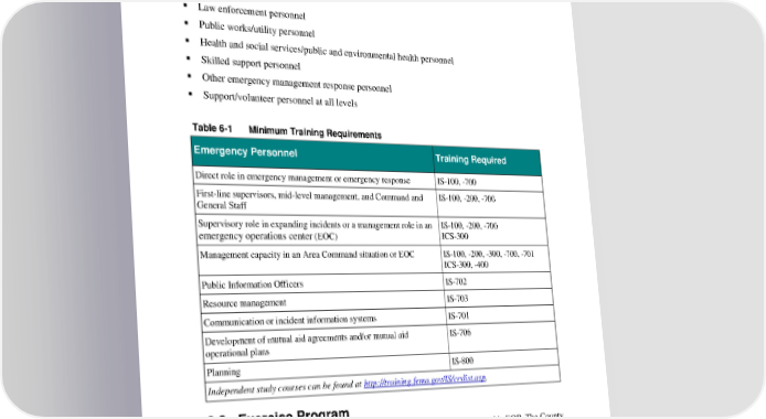 Clark County EOP Basic Plan 6. Plan Development, Maintenance and Implementation Manager maintains records and lists of training received by County personnel. Training requirements apply to all first responders and disaster workers, including first-line supervisors, middle management, and Command and General Staff, as well as: EMS personnel Firefighters Law enforcement personnel Public works/utility personnel Health and social services/public and environmental health personnel Skilled support personnel Other emergency management response personnel Support/volunteer personnel at all levels Table 6-1 Minimum Training Requirements Emergency Personnel Training Required Direct role in emergency management or emergency response IS-100, -700 First-line supervisors, mid-level management, and Command and IS-100, -200, -700 General Staff Supervisory role in expanding incidents or a management role in an IS-100, -200, -700 emergency operations center (EOC) ICS-300 Management capacity in an Area Command situation or EOC IS-100, -200, -300, -700, -701 ICS-300, -400 Public Information Officers IS-702 Resource management IS-703 Communication or incident information systems IS-701 Development of mutual aid agreements and/or mutual aid IS-706 operational plans Planning IS-800 Independent study courses can be found at http://training.fema.gov/IS/crslist.asp. 6.3 Exercise Program The County will conduct exercises throughout the year to test and evaluate this EOP. The County will coordinate with agencies; organizations (nonprofit, for profit, and volunteer); neighboring jurisdictions; and State and federal government to participate in joint exercises. These exercises will consist of a variety of tabletop exercises, drills, functional exercises, and full-scale exercises. 6-2