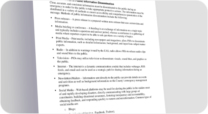 Clark County EOP Basic Plan 3. Concept of Operations a community can call people to action, educate and inform, change behavior and attitudes, create a positive impression of the County’s EMO, and prepare the community for an emergency. See Section 5.5.2 for additional information regarding PIO responsibilities and Section 5.3.4 for information regarding establishing a Joint Information Center. 3.4.5.1 Methods of Public Information Dissemination Clear, accurate, and consistent information must be disseminated to the public during an emergency in order for the public to take appropriate protective actions. The information must be distributed in a variety of methods to ensure accessibility and comprehensive penetration of the message. Methods of public information dissemination include the following: Press releases – A press release is a prepared written news release that uses current data and information. Media briefing or conference – A briefing is an exchange of information on a single topic and typically includes a question-and-answer period, whereas a conference is a gathering of media where reporters expect to be able to ask questions on a variety of topics. Print Media – Print media, including newspapers and magazines, allow PIOs to disseminate public information, such as detailed information, background, and input from subject matter experts. Radio – In addition to warnings issued by the EAS, radio allows PIOs to release audio clips and sound bites to the public. Television – PIOs may utilize television to disseminate visuals, sound bites, and graphics to the public. Internet – The internet is a dynamic communication conduit that includes webpages, RSS feeds, and email and can be used as a strategic path for sharing information during an emergency. Newsletters/Mailers – Information sent directly to the public can provide details on events and activities as well as background information on the County’s emergency management programs. Social Media – Web-based platforms may be used for alerting the public in the sudden onset of and rapidly developing disasters, directly communicating with large groups of constituents, building situational awareness, fostering transparency and accountability, obtaining feedback, and responding quickly to rumors and misinformation. Common types of social media are: o Blogs; o Social networking (e.g., Facebook, Twitter); o Media sharing (e.g., YouTube, Flickr, Pinterest, Instagram); and o Wiki. Call Center – May be used as a way to divert unnecessary calls away from the 9-1-1 system, gather information to increase situational awareness of the incident, and disseminate emergency public information. 3-9