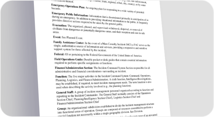 Clark County EOP Basic Plan Appendix B. Acronyms and Glossary Emergency Operations Center (EOC): The physical location at which the coordination of information and resources to support incident management (on-scene operations) activities normally takes place. An EOC may be a temporary facility or may be located in a more central or permanently established facility, perhaps at a higher level of organization within a jurisdiction. EOCs may be organized by major functional disciplines (e.g., fire, law enforcement, medical services), by jurisdiction (e.g., Federal, State, regional, tribal, city, county), or by some combination thereof. Emergency Operations Plan: An ongoing plan for responding to a wide variety of potential hazards. Emergency Public Information: Information that is disseminated primarily in anticipation of or during an emergency. In addition to providing situational information to the public, it frequently provides directive actions required to be taken by the general public. Evacuation: The organized, phased, and supervised withdrawal, dispersal, or removal of civilians from dangerous or potentially dangerous areas, and their reception and care in safe areas. Event: See Planned Event. Family Assistance Center: In the event of a Mass Casualty Incident (MCI) a FAC serves as the single, authoritative source of information and services, providing a responsive and sensitive support system for those affected by the incident. Federal: Of or pertaining to the Federal Government of the United States of America. Field Operations Guide: Durable pocket or desk guides that contain essential information required to perform specific assignments or functions. Finance/Administration Section: The Incident Command System Section responsible for all administrative and financial considerations surrounding an incident. Function: The five major activities in the Incident Command System: Command, Operations, Planning, Logistics, and Finance/Administration. A sixth function, Intelligence/Investigations, may be established, if required, to meet incident management needs. The term function is also used when describing the activity involved (e.g., the planning function). General Staff: A group of incident management personnel organized according to function and reporting to the Incident Commander. The General Staff normally consists of the Operations Section Chief, Planning/Intelligence Section Chief], Logistics Section Chief and Finance/Administration Section Chief Group: An organizational subdivision established to divide the incident management structure into functional areas of operation. Groups are composed of resources assembled to perform a special function not necessarily within a single geographic division. See Division. Hazard: Something that is potentially dangerous or harmful, often the root cause of an unwanted outcome. Homeland Security Presidential Directive 5 (HSPD-5): HSPD-5 was issued in 2003 and established a single, comprehensive National Incident Management System. This management system is designed to cover the prevention, preparation, response, and recovery from terrorist attacks, major disasters, and other emergencies. HSPD-5 requires the Department of Homeland D-7