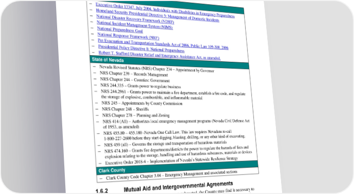 Clark County EOP Basic Plan 1. Introduction 1.6.1 Legal Authorities Table 1-1 sets forth the federal, State, and local legal authorities upon which the organizational and operational concepts of this EOP are based. Table 1-1 Legal Authorities Federal ― Executive Order 13347, July 2004, Individuals with Disabilities in Emergency Preparedness ― Homeland Security Presidential Directive 5: Management of Domestic Incidents ― National Disaster Recovery Framework (NDRF) ― National Incident Management System (NIMS) ― National Preparedness Goal ― National Response Framework (NRF) ― Pet Evacuation and Transportation Standards Act of 2006, Public Law 109-308, 2006 ― Presidential Policy Directive 8: National Preparedness ― Robert T. Stafford Disaster Relief and Emergency Assistance Act, as amended. State of Nevada ― Nevada Revised Statutes (NRS) Chapter 234 – Appointment by Governor ― NRS Chapter 239 – Records Management ― NRS Chapter 244 – Counties: Government ― NRS 244.335 – Grants power to regulate business ― NRS 244.2961 – Grants power to maintain a fire department, establish a fire code, and regulate the storage of explosive, combustible, and inflammable material ― NRS 245 – Appointments by County Commission ― NRS Chapter 248 – Sheriffs ― NRS Chapter 278 – Planning and Zoning ― NRS 414 (All) – Authorizes local emergency management programs (Nevada Civil Defense Act of 1953, as amended) ― NRS 455.80 – 455.180 -Nevada One Call Law. This law requires Nevadans to call 1-800-227-2600 before they start digging, blasting, drilling, or any other kind of excavating. ― NRS 459 (all) – Governs the storage and transportation of hazardous materials ― NRS 474.160 – Grants fire departments/districts the power to regulate the hazards of fires and explosion relating to the storage, handling and use of hazardous substances, materials or devices ― Executive Order 2018-4 – Implementation of Nevada’s Statewide Resilience Strategy Clark County ― Clark County Code Chapter 3.04 – Emergency Management and associated sections 1.6.2 Mutual Aid and Intergovernmental Agreements When local emergency response resources are exhausted, the County may find it necessary to procure additional resources from partners. A number of mutual aid and intergovernmental agreements exist to allow outside resources to be accessed by the County. Copies of these documents can be accessed through the Emergency Manager. During an emergency situation, a local proclamation may be necessary to activate these agreements and allocate appropriate resources. 1-8