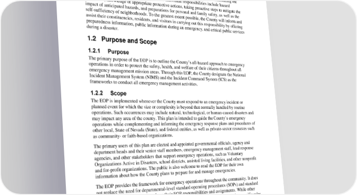 Clark County EOP Basic Plan 1. Introduction and the public, including survivors of an incident. Whole community planning also means engaging populations and partners who may not traditionally have been engaged and considering how actions guided by an emergency plan may impact disadvantaged communities. Every person who lives or works in the community shares responsibility for minimizing the impact of disasters on the community. These individual responsibilities include hazard awareness, knowledge of appropriate protective actions, taking proactive steps to mitigate the impact of anticipated hazards, and preparations for personal and family safety, as well as the self-sufficiency of neighborhoods. To the greatest extent possible, the County will inform and assist their constituencies, residents, and visitors in carrying out this responsibility by offering preparedness information, public information during an emergency, and critical public services during a disaster. 1.2 Purpose and Scope 1.2.1 Purpose The primary purpose of the EOP is to outline the County’s all-hazard approach to emergency operations in order to protect the safety, health, and welfare of their citizens throughout all emergency management mission areas. Through this EOP, the County designate the National Incident Management System (NIMS) and the Incident Command System (ICS) as the frameworks to conduct all emergency management activities. 1.2.2 Scope The EOP is implemented whenever the County must respond to an emergency incident or planned event for which the size or complexity is beyond that normally handled by routine operations. Such occurrences may include natural, technological, or human-caused disasters and may impact any area of the county. This plan is intended to guide the County’s emergency operations while complementing and informing the emergency response plans and procedures of other local, State of Nevada (State), and federal entities, as well as private-sector resources such as community- or faith-based organizations. The primary users of this plan are elected and appointed governmental officials, agency and department heads and their senior staff members, emergency management staff, lead response agencies, and other stakeholders that support emergency operations, such as Voluntary Organizations Active in Disasters, school districts, assisted living facilities, and other nonprofit and for-profit organizations. The public is also welcome to read the EOP for their own information about how the County plans to prepare for and manage emergencies. The EOP provides the framework for emergency operations throughout the community. It does not replace the need for departmental-level standard operating procedures (SOPs) and standard operating guides (SOGs) to perform their EOP responsibilities and assignments. While other governmental and nongovernmental resources are identified in this EOP as having specific roles and responsibilities, those resources are responsible for developing and implementing their own EOP/SOP/SOG. 1-2