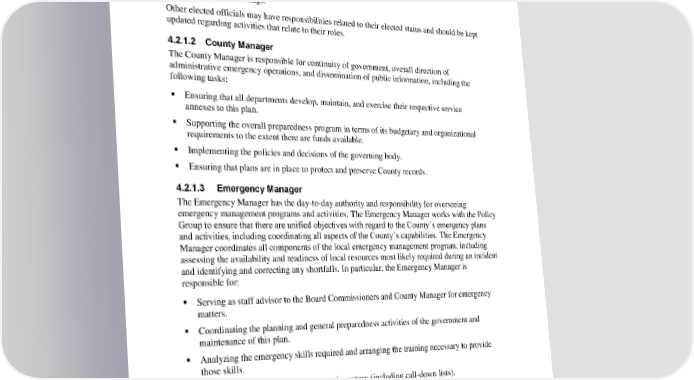 Clark County EOP Basic Plan 4. Roles and Responsibilities Declaring a State of Emergency and providing support to the on-scene Incident Commander in requesting assistance through the County. Acting as liaison to the community during activation of the MACC. Acting on emergency funding needs. Attending PIO briefings. Other elected officials may have responsibilities related to their elected status and should be kept updated regarding activities that relate to their roles. 4.2.1.2 County Manager The County Manager is responsible for continuity of government, overall direction of administrative emergency operations, and dissemination of public information, including the following tasks: Ensuring that all departments develop, maintain, and exercise their respective service annexes to this plan. Supporting the overall preparedness program in terms of its budgetary and organizational requirements to the extent there are funds available. Implementing the policies and decisions of the governing body. Ensuring that plans are in place to protect and preserve County records. 4.2.1.3 Emergency Manager The Emergency Manager has the day-to-day authority and responsibility for overseeing emergency management programs and activities. The Emergency Manager works with the Policy Group to ensure that there are unified objectives with regard to the County’s emergency plans and activities, including coordinating all aspects of the County’s capabilities. The Emergency Manager coordinates all components of the local emergency management program, including assessing the availability and readiness of local resources most likely required during an incident and identifying and correcting any shortfalls. In particular, the Emergency Manager is responsible for: Serving as staff advisor to the Board Commissioners and County Manager for emergency matters. Coordinating the planning and general preparedness activities of the government and maintenance of this plan. Analyzing the emergency skills required and arranging the training necessary to provide those skills. Preparing and maintaining a resource inventory (including call-down lists). Ensuring the operational capability of the MACC. Activating the MACC. Keeping the Board of Commissioners and County Manager apprised of the County’s preparedness status and anticipated needs. 4-3