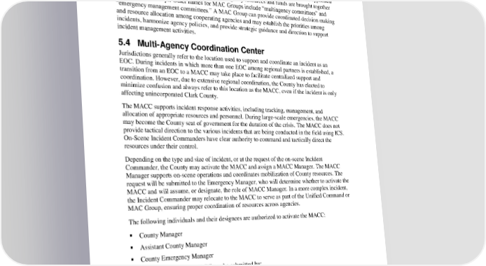 Clark County EOP Basic Plan 5. Command and Control 5.3.3 Multi-Agency Coordination In the event that the County is coordinating a response with other jurisdictions or agencies with authority over the incident, it may choose to implement a Multi-Agency Coordination Group (MAC Group) and establish the MACC. Typically, administrators/executives, or their appointed representatives, who are authorized to commit agency resources and funds are brought together to form MAC Groups. Other names for MAC Groups include “multiagency committees” and “emergency management committees.” A MAC Group can provide coordinated decision making and resource allocation among cooperating agencies and may establish the priorities among incidents, harmonize agency policies, and provide strategic guidance and direction to support incident management activities. 5.4 Multi-Agency Coordination Center Jurisdictions generally refer to the location used to support and coordinate an incident as an EOC. During incidents in which more than one EOC among regional partners is established, a transition from an EOC to a MACC may take place to facilitate centralized support and coordination. However, due to extensive regional coordination, the County has elected to minimize confusion and always refer to this location as the MACC, even if the incident is only affecting unincorporated Clark County. The MACC supports incident response activities, including tracking, management, and allocation of appropriate resources and personnel. During large-scale emergencies, the MACC may become the County seat of government for the duration of the crisis. The MACC does not provide tactical direction to the various incidents that are being conducted in the field using ICS. On-Scene Incident Commanders have clear authority to command and tactically direct the resources under their control. Depending on the type and size of incident, or at the request of the on-scene Incident Commander, the County may activate the MACC and assign a MACC Manager. The MACC Manager supports on-scene operations and coordinates mobilization of County resources. The request will be submitted to the Emergency Manager, who will determine whether to activate the MACC and will assume, or designate, the role of MACC Manager. In a more complex incident, the Incident Commander may relocate to the MACC to serve as part of the Unified Command or MAC Group, ensuring proper coordination of resources across agencies. The following individuals and their designees are authorized to activate the MACC: County Manager Assistant County Manager County Emergency Manager Requests to activate the MACC can be submitted by: County Manager Local Emergency Managers Fire Chief Police Chief 5-4