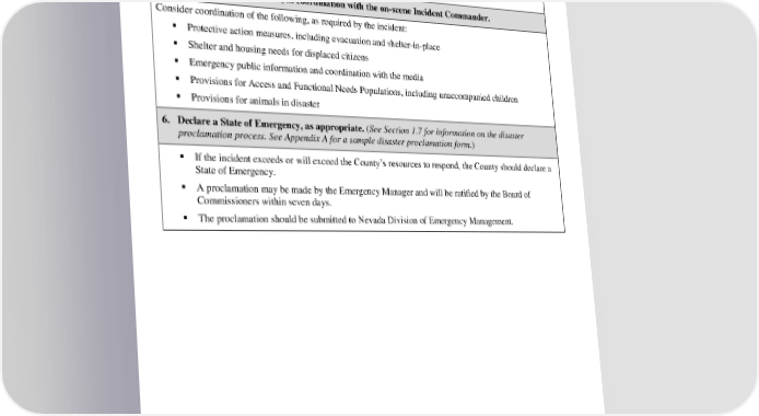 Clark County EOP Basic Plan Immediate Action Checklist 4. Establish communications with the on-scene Incident Commander. (See ESF 2 – Telecommunications for more information on communications systems.) Identify primary and back-up means to maintain contact with the on-scene Incident Commander. 5. Identify key incident needs, in coordination with the on-scene Incident Commander. Consider coordination of the following, as required by the incident: Protective action measures, including evacuation and shelter-in-place Shelter and housing needs for displaced citizens Emergency public information and coordination with the media Provisions for Access and Functional Needs Populations, including unaccompanied children Provisions for animals in disaster 6. Declare a State of Emergency, as appropriate. (See Section 1.7 for information on the disaster proclamation process. See Appendix A for a sample disaster proclamation form.) If the incident exceeds or will exceed the County’s resources to respond, the County should declare a State of Emergency. A proclamation may be made by the Emergency Manager and will be ratified by the Board of Commissioners within seven days. The proclamation should be submitted to Nevada Division of Emergency Management. iv