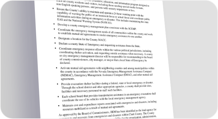Clark County EOP Basic Plan 1. Introduction referred to generally in this EOP as the Clark County Office of Emergency Management (OEM). In accordance with the SCEMP, OEM should be prepared to: Maintain an emergency management program at the county level which involves all local government agencies, private, nongovernmental, and volunteer organizations. Implement a broad-based public awareness, education, and information program designed to reach all county residents and visitors, including those needing special media formats, non-English speaking persons, and persons with sensory impairment or loss. Ensure the County’s ability to maintain and operate a 24-hour warning point with the capability of warning the public of an imminent threat or actual threat and coordinate public information activities during an emergency or disaster. This includes maintaining the state EAS and the National Warning System (NAWAS). Develop a county emergency management plan consistent with the SCEMP. Coordinate the emergency management needs of all communities within the county and work to establish mutual aid agreements to render emergency assistance to one another. Designate a location for the County MACC. Declare a county State of Emergency and requesting assistance from the State. Coordinate emergency response efforts within the various political jurisdictions, including coordinating shelter activation, and requesting outside assistance when necessary. A county or city emergency management director will be responsible for recommending to the board of county commissioners, city manager, or mayor that a local State of Emergency be declared. Activate mutual aid agreements with neighboring counties and among municipalities within the county in accordance with the Nevada Emergency Management Assistance Compact (NEMAC), Emergency Management Assistance Compact (EMAC), and other mutual aid agreements. Provide evacuation shelter facilities during a federal, state or local emergency or disaster. Through the school district and other appropriate agencies, a county shall provide sites, facilities and necessary personnel to staff such facilities. Each school board that provides transportation assistance in an emergency evacuation shall coordinate the use of its vehicles with the local emergency management agency. Maintain cost and expenditure reports associated with emergencies and disasters, including resources mobilized as a result of mutual aid agreements. As approved by the Board of Commissioners, OEM has been identified as the lead agency for response to and recovery from emergencies and disasters within Clark County. The County Emergency Manager has the authority and responsibility for the organization, administration, and operations of OEM. The Emergency Manager may delegate any of these activities to designees, as appropriate. 1-7
