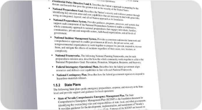 Clark County EOP Basic Plan 1. Introduction 1.5 Relationship to Other Plans 1.5.1 Federal Plans The following federal plans guide emergency preparedness, response, and recovery at the federal level and provide support and guidance for state and local operations: Presidential Policy Directive 5 and 8. Describes the Nation’s approach to preparing for the threats and hazards that pose the greatest risk to the security of the United States. National Preparedness Goal. Describes the Nation’s security and resilience posture through identifying key mission areas and core capabilities that are necessary to deal with great risks, using an integrated, layered, and all-of-Nation approach as its foundation. National Preparedness System. Provides guidance, programs, processes, and systems that support each component of the National Preparedness System to enable a collaborative, whole community approach to national preparedness that engages individuals, families, communities, private and nonprofit sectors, faith-based organizations, and all levels of government. National Incident Management System. Provides a consistent nationwide framework and comprehensive approach to enable government at all levels, the private sector, and nongovernmental organizations to work together to prepare for, prevent, respond to, recover from, and mitigate the effects of incidents regardless of their cause, size, location, or complexity. National Frameworks. The following National Planning Frameworks, one for each preparedness mission area, describe how the whole community works together to achieve the National Preparedness Goal: Prevention, Protection, Mitigation, Response, and Recovery. Federal Interagency Operational Plans. Describes how the federal government aligns resources and delivers core capabilities in line with each National Framework. National Contingency Plan. Describes how the federal government organizes to respond to hazardous materials releases. 1.5.2 State Plans The following State plans guide emergency preparedness, response, and recovery at the State level and provide support and guidance for local operations: State of Nevada Comprehensive Emergency Management Plan. The State Comprehensive Emergency Management Plan (SCEMP) is the foundation document for identifying the overarching roles and responsibilities of state, local, and tribal governments. It provides guidance for the development, implementation, and sustainment of Nevada’s emergency management and coordination efforts. Purposes of the SCEMP are focused on providing an executive overview of coordinated emergency response functions and recovery processes. Goals and objectives of the plan are centered on safeguarding the well-being of Nevada’s populations; protection of property, the infrastructure, and environment; and the economic stability of the State. 1-4