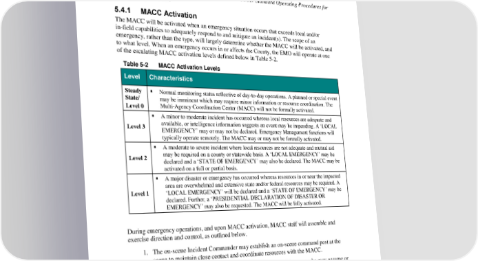 Clark County EOP Basic Plan 5. Command and Control Sheriff Tribal Chair Chief Health Officer Refer to the Southern Nevada Emergency Operations Center Standard Operating Procedures for additional information. 5.4.1 MACC Activation The MACC will be activated when an emergency situation occurs that exceeds local and/or in-field capabilities to adequately respond to and mitigate an incident(s). The scope of an emergency, rather than the type, will largely determine whether the MACC will be activated, and to what level. When an emergency occurs in or affects the County, the EMO will operate at one of the escalating MACC activation levels defined below in Table 5-2. Table 5-2 MACC Activation Levels Level Characteristics Steady Normal monitoring status reflective of day-to-day operations. A planned or special event State/ may be imminent which may require minor information or resource coordination. The Level 0 Multi-Agency Coordination Center (MACC) will not be formally activated. A minor to moderate incident has occurred whereas local resources are adequate and Level 3 available, or intelligence information suggests an event may be impending. A ‘LOCAL EMERGENCY’ may or may not be declared. Emergency Management functions will typically operate remotely. The MACC may or may not be formally activated. A moderate to severe incident where local resources are not adequate and mutual aid Level 2 may be required on a county or statewide basis. A ‘LOCAL EMERGENCY’ may be declared and a ‘STATE OF EMERGENCY’ may also be declared. The MACC may be activated on a full or partial basis. A major disaster or emergency has occurred whereas resources in or near the impacted area are overwhelmed and extensive state and/or federal resources may be required. A Level 1 ‘LOCAL EMERGENCY’ will be declared and a ‘STATE OF EMERGENCY’ may be declared. Further, a ‘PRESIDENTIAL DECLARATION OF DISASTER OR EMERGENCY’ may also be requested. The MACC will be fully activated. During emergency operations, and upon MACC activation, MACC staff will assemble and exercise direction and control, as outlined below. 1. The on-scene Incident Commander may establish an on-scene command post at the scene to maintain close contact and coordinate resources with the MACC. 2. The MACC will be activated by the County Emergency Manager, who may assume or designate the role of MACC Manager. While the on-scene Incident Commander retains tactical control of the incident, the MACC Manager assumes responsibility for coordinating and prioritizing County resources in support of emergency operations. 5-5