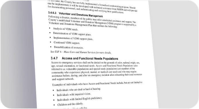 Clark County EOP Basic Plan 3. Concept of Operations resource-typed list can increase the usefulness of the tools requested during an emergency and may reduce costs by eliminating orders for equipment that are inaccurate or inappropriate for the situation. Response personnel and support staff are trained and exercised using resource typing lists to ensure familiarity with the standard terminology for commonly requested resources. 3.4.6.2 Credentialing of Personnel At this time, the County has not fully implemented a formalized credentialing program. Should one be implemented, it will be developed with technical assistance from NDEM and will provide for documenting personnel, and authenticating and verifying their qualifications. 3.4.6.3 Volunteer and Donations Management Following a disaster, members of the public may offer unsolicited assistance and support. The County’s established Volunteer and Donation Management (VDM) program is supported by a Volunteer and Donations Management Plan that outlines the following: Analysis of VDM needs. Determination of VDM support plans. Implementation of VDM support plans. Continued VDM support. Demobilization of resources. See ESF 6 – Mass Care and Human Services for more details. 3.4.7 Access and Functional Needs Populations Access to emergency services shall not be denied on the grounds of color, national origin, sex, age, sexual orientation, or functional needs. Access and Functional Needs Populations (also referred to as vulnerable populations and special needs populations) are members of the community who experience physical, mental, or medical care needs and who may require assistance before, during, and after an emergency incident after exhausting their usual resources and support network. Examples of individuals who have Access and Functional Needs include, but are not limited to: Individuals who are deaf or hard of hearing. Individuals with impaired vision. Individuals with limited English proficiency. Children and the elderly. Individuals without vehicles. Individuals with special dietary needs. Individuals who experience physical disabilities. Individuals with medical equipment requiring power (e.g., ventilators). Pregnant women. 3-11