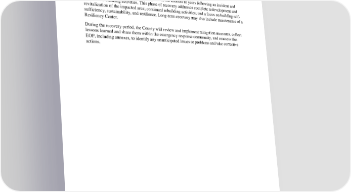 Clark County EOP Basic Plan 3. Concept of Operations and buildings; providing financial, social, and psychological support to community members; and mitigating future risks. Intermediate recovery activities may include maintenance of a Family Assistance Center and establishment or maintenance of a Resiliency Center and related public information. Long-term recovery operations take place in the months to years following an incident and focus on revitalizing activities. This phase of recovery addresses complete redevelopment and revitalization of the impacted area; continued rebuilding activities; and a focus on building self- sufficiency, sustainability, and resilience. Long-term recovery may also include maintenance of a Resiliency Center. During the recovery period, the County will review and implement mitigation measures, collect lessons learned and share them within the emergency response community, and reassess this EOP, including annexes, to identify any unanticipated issues or problems and take corrective actions. 3-15