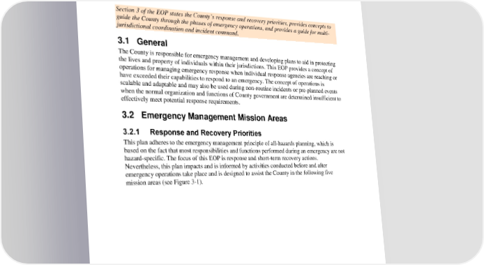 Clark County EOP Basic Plan 3. Concept of Operations 3 Concept of Operations Section 3 of the EOP states the County’s response and recovery priorities, provides concepts to guide the County through the phases of emergency operations, and provides a guide for multi- jurisdictional coordination and incident command. 3.1 General The County is responsible for emergency management and developing plans to aid in protecting the lives and property of individuals within their jurisdictions. This EOP provides a concept of operations for managing emergency response when individual response agencies are reaching or have exceeded their capabilities to respond to an emergency. The concept of operations is scalable and adaptable and may also be used during non-routine incidents or pre-planned events when the normal organization and functions of County government are determined insufficient to effectively meet potential response requirements. 3.2 Emergency Management Mission Areas 3.2.1 Response and Recovery Priorities This plan adheres to the emergency management principle of all-hazards planning, which is based on the fact that most responsibilities and functions performed during an emergency are not hazard-specific. The focus of this EOP is response and short-term recovery actions. Nevertheless, this plan impacts and is informed by activities conducted before and after emergency operations take place and is designed to assist the County in the following five mission areas (see Figure 3-1). 3-1
