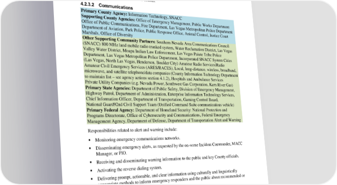 Clark County EOP Basic Plan 4. Roles and Responsibilities Coordinating the restoration and recovery of County transportation systems and infrastructure. Coordinating support of emergency operations activities among transportation stakeholders within the County’s authorities and resources limitations. See ESF 1 – Transportation for more details. 4.2.3.2 Communications Primary County Agency: Information Technology, SNACC Supporting County Agencies: Office of Emergency Management, Public Works Department Office of Public Communications, Fire Department, Las Vegas Metropolitan Police Department Department of Aviation, Park Police, Public Response Office, Animal Control, Justice Court Marshals, Office of Diversity Other Supporting Community Partners: Southern Nevada Area Communications Council (SNACC) 800 MHz land mobile radio trunked system, Water Reclamation District, Las Vegas Valley Water District, Moapa Indian Law Enforcement, Las Vegas Paiute Tribe Police Department, Las Vegas Metropolitan Police Department, Incorporated SNACC System Cities (Las Vegas, North Las Vegas, Henderson, Boulder City) Amateur Radio Services/Radio Amateur Civil Emergency Services (ARES/RACES), Local, long-distance, wireless, broadband, microwave, and satellite telephone/data companies (County Information Technology Department to maintain list – see agency actions section 4.1.2), Hospitals and Ambulance Services Private Utility Companies (e.g. Nevada Power, Southwest Gas Corporation, Kern River Gas) Primary State Agencies: Department of Public Safety, Division of Emergency Management, Highway Patrol, Department of Administration, Enterprise Information Technology Services, Chief Information Officer, Department of Transportation, Gaming Control Board, National Guard92nd Civil Support Team (Unified Command Suite communications vehicle) Primary Federal Agency: Department of Homeland Security: National Protection and Programs Directorate, Office of Cybersecurity and Communications, Federal Emergency Management Agency, Department of Defense, Department of Transportation Alert and Warning Responsibilities related to alert and warning include: Monitoring emergency communications networks. Disseminating emergency alerts, as requested by the on-scene Incident Commander, MACC Manager, or PIO. Receiving and disseminating warning information to the public and key County officials. Activating the reverse dialing system. Delivering prompt, actionable, and clear information using culturally and linguistically appropriate methods to inform emergency responders and the public about recommended or required protective measures. Communication Systems Communication-related responsibilities include: Establishing and maintaining emergency communications systems. 4-6